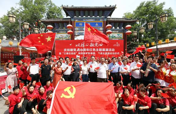 2021年6月30日上午,“三秦在追超——庆祝建党100周年影像展播”首站展播走进西安永兴坊。来自省、市、区相关部门领导、企事业单位、高等院校、行业协会、非遗传承人、媒体等约500余人参加了本次活动。