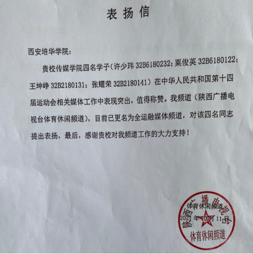 在刚刚结束的全国第十四届运动会和全国第十一届残疾人运动会暨第八届特殊奥林匹克运动会中,陕西广播电视台全运融媒体频道特向我校传媒学院2018级网络与新媒体专业许少玮、粟俊英,2018级广播电视编导专业王坤峥、张耀荣四名同学发来表扬信,对该四名同学作为全运融媒体频道新闻组实习生协助完成赛事相关新闻报道与后期制作等工作表现给予充分肯定和赞扬。