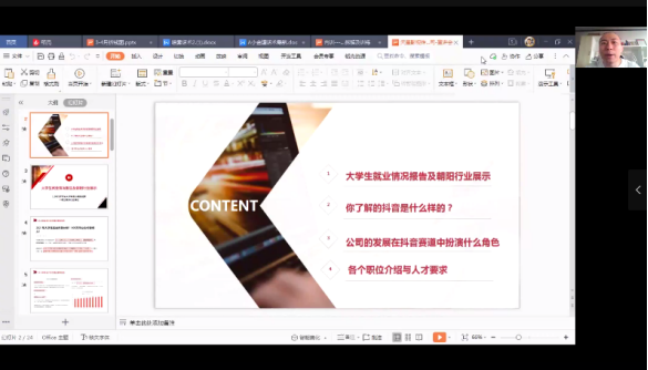 为了帮助传媒学院学生在疫情防控背景下准确有效地确定就业方向,明确个人职业规划方向,2022年5月10日15时,传媒学院邀请到西安天星影视传媒有限公司创始人邱悦先生,通过线上会议的形式,进行了一场主题为“疫情形势下的逆势增长赛道——抖音电商的从业前景”的主题讲座,讲座由西安培华学院传媒学院学生干事乔安老师主持,传媒学院2019级、2018级学生代表百余人参加了本次活动。