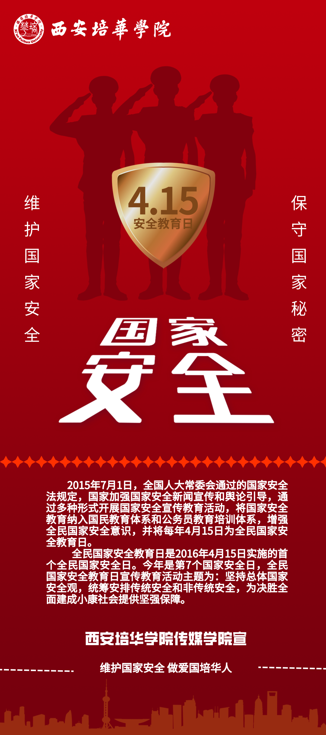 今年4月15日是第七个全民国家安全教育日,为深入宣传习近平总书记关于总体国家安全观和国家安全工作的重要论述,进一步做好学生国家安全教育,引导学生树立总体国家安全观,以实际行动迎接党的二十大胜利召开。传媒学院于4月14日下午19:00举行了以“4.15国家安全教育日”为主题的线上会议,其中传媒学院团委和传媒学院学生会也参与承办了此次活动。本次会议由张保奇主持。
