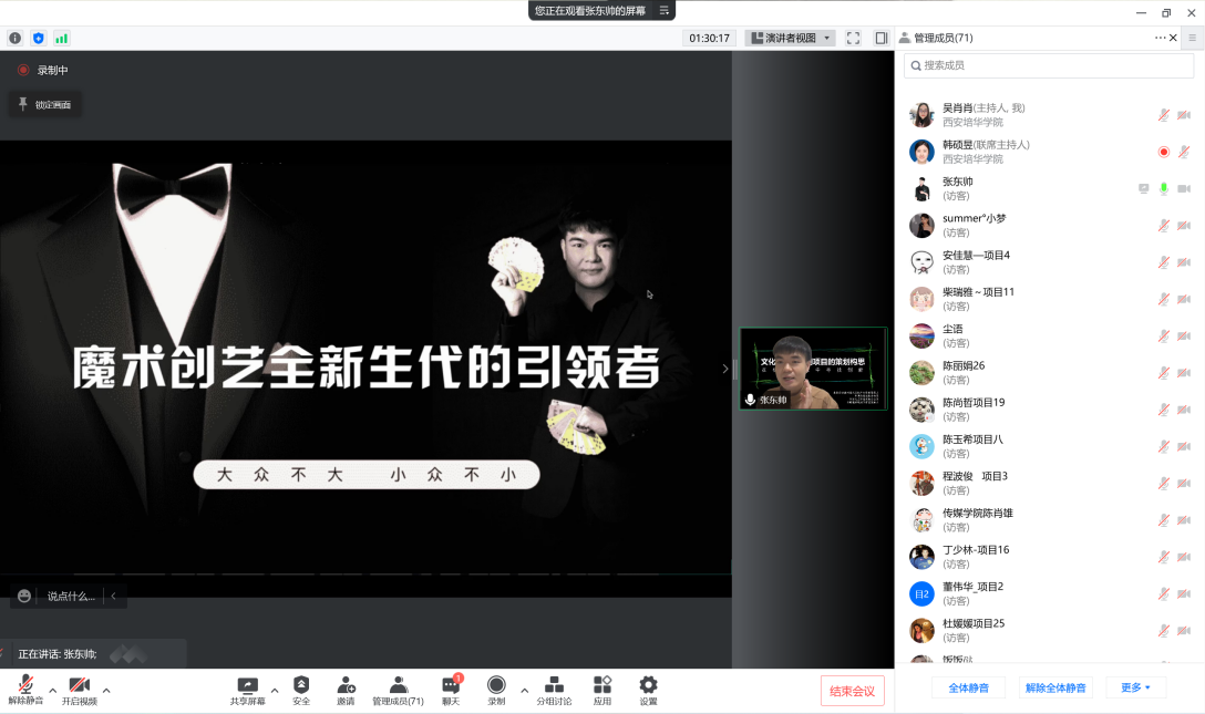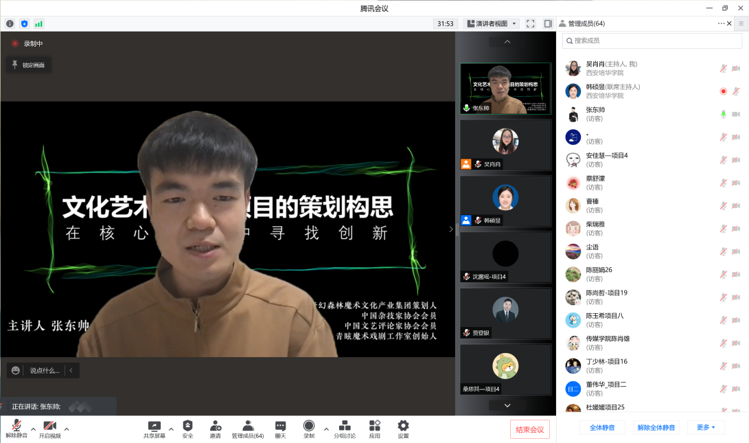 主讲人张东帅,是传媒学院播音与主持艺术21届毕业校友,现为北京奇幻森林魔术文化产业集团有限公司策划人、中国杂技家协会会员、中国文艺评论家协会会员。在校期间,曾获得第十二届“挑战杯”中国大学生创业计划竞赛铜奖、第六届中国国际“互联网+”大学生创新创业大赛陕西赛区金奖兼最具人气奖、第十届“挑战杯”陕西省大学生创业计划竞赛金奖等各级文艺和双创大赛奖项。2020年,获得教育部国家奖学金。2021年,斩获第七届中国国际“互联网+”大学生创新创业大赛全国铜奖。
