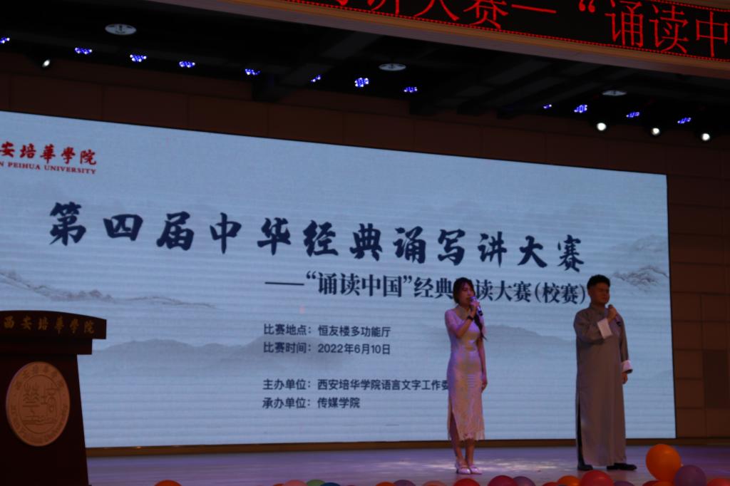 为贯彻落实中共中央办公厅、国务院办公厅《关于实施中华优秀传统文化传承发展工程的意见》和全国教育大会精神,全面深入实施中华经典诵读工程,传承弘扬中华优秀传统文化,引领广大师生亲近中华经典,增强爱党爱国情怀,2022年6月10日下午14:00-18:00,由西安培华学院语言文字工作委员会主办、传媒学院承办的西安培华学院全国第四届中华经典诵写讲大赛“诵读中国”经典诵读大赛在恒友楼多功能厅成功举办。