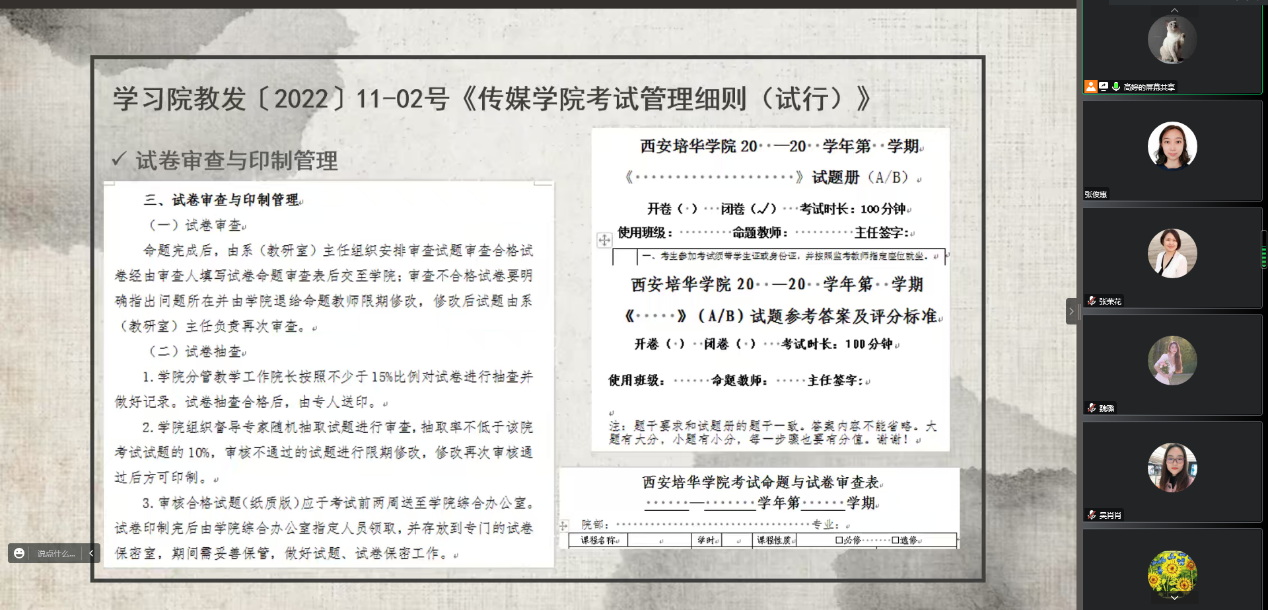 学院教学干事高婷首先反馈了学校2021-2022-1学期本科实习实践课程评估工作和校级2021-2022学年本科课程过程性考核资料专项检查情况,特别是对学院存在的问题进行了通报。随后她代表学院对本学期结课资料收取工作进行了安排,重点带大家学习了《传媒学院考试管理细则(试行)》文件精神,对本学期期末学院考试工作就命题、审题、评阅、监考等环节进行了详解的介绍和安排,并就学院对接专业结课资料流程和规范做了要求。
