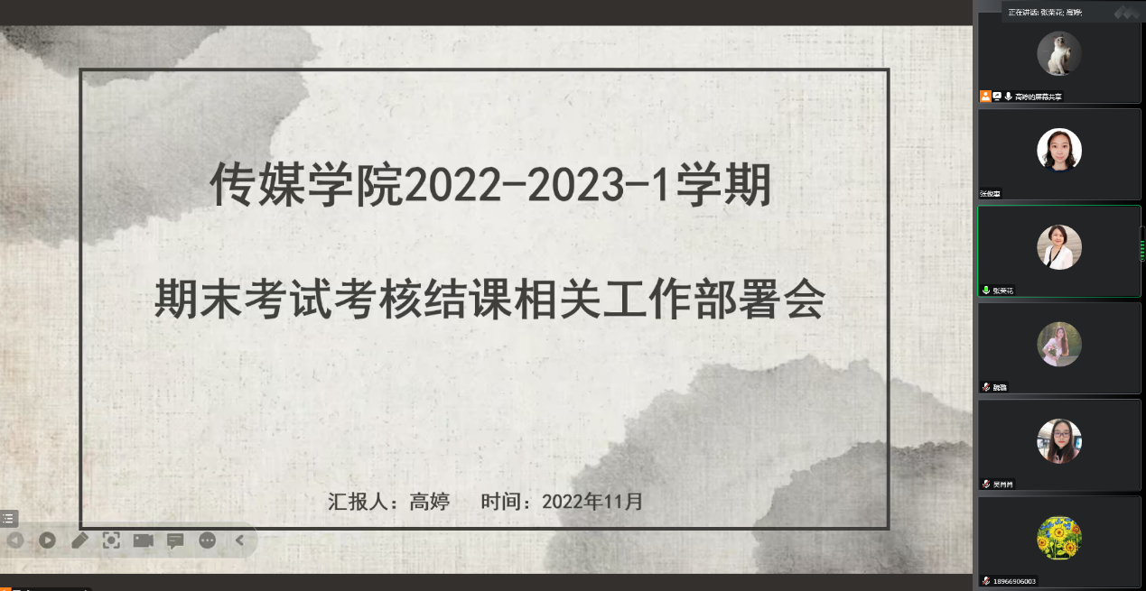 为进一步规范传媒学院课程结课考核工作,提升我院教育教学质量,扎实推进本科教学审核评估迎评创建工作,2022年11月10日下午,传媒学院线上召开了2022-2023学年第一学期期末考试考核结课相关工作部署会,传媒学院副院长张荣花、教科研干事、学科带头人、系(副)主任、专业考试考核和实践实训结课资料负责老师、本学期有考试模块老师参加了此次会议。