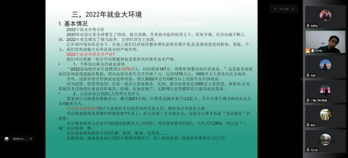 任祚旺老师就2022年国内就业环境和国际形势等多方面展开论述,不仅介绍了2022年就业形势的基本情况,还剖析了在恶劣的就业环境下,求职者即将面临的众多挑战。宏观上我们经济保持整体增长态势,但是从微观角度看,部分群体、家庭、个人,依然可能面临失业和再就业的严峻形势。