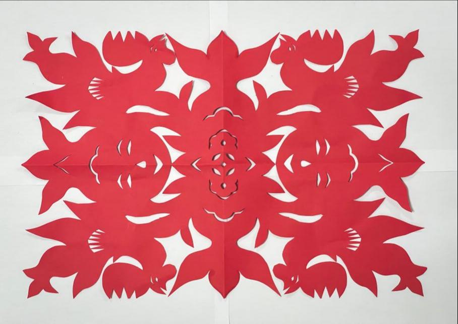 为了让大家体现剪纸的创作,贾老师为参会师生进行了现场展示,一把小小的剪刀在贾老师手中运用的游刃有余,短短5分钟的时间,一幅“鸡鸣盛世,年年有鱼”便铺展开来。一把剪刀、一张纸便能创造出这样精美绝伦的剪纸作品,这就是中华传统文化的独特魅力。