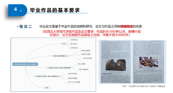 在毕业论文写作模块,吉教授通过对论文定义、分类和写作流程等方面内容的介绍,帮助同学们在写作思路、原则与规范、框架结构等方面进行规范和拓展。除此之外,教授在各环节中,加入大量案例汇总,着力为同学们在意识、工具、方法层面提供多层次深入指导。结合毕业创作,吉教授列出毕业作品的三种情况,对其形式及基本要求分别进行阐释、举例与分析。
