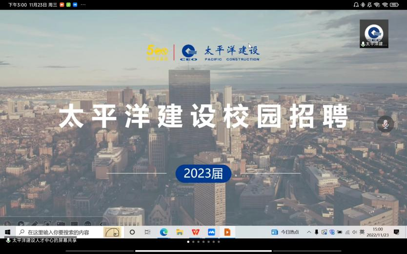 太平洋建设集团有限公司连续九年入选了世界五百强同时也是2022年中国企业500强第48位,蝉联全球建筑业私企第一。三十多年来,太平洋建设专注于基础设施的投资、建设与管理,在中国城市化、城镇化、城乡一体化的进程中,太平洋建设融资源、智慧、资本于一体,是中国最大的城市经营商。太平洋建设集团有限公司人才中心人事经理郭赛向同学们介绍企业的基本信息,展开说明了集团的简介、人才的需求以及薪酬福利等相关信息。