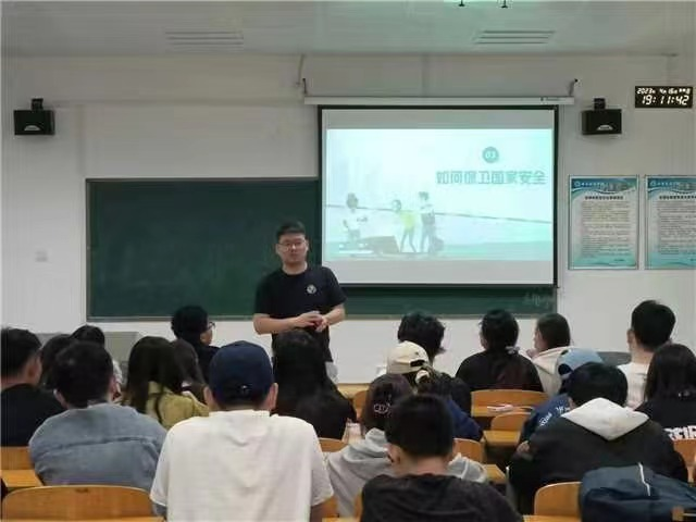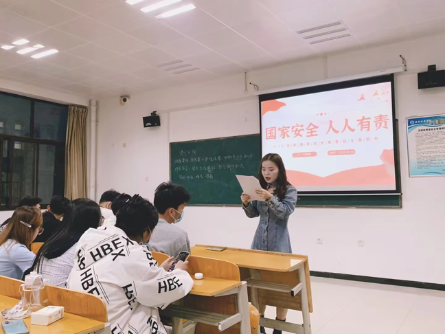 辅导员王璐在班会中强调要坚持总体国家安全观,坚持发展和安全并重,切实把思想和行动统一到党中央的总体部署上来,全体同学同频共振、步调一致。每个人都要讲好维护国家安全的故事,汇聚起维护国家安全人人有责、人人尽责、人人共享的强大合力。