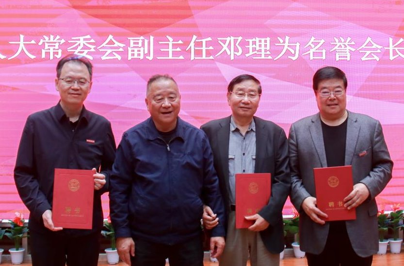 陕西省十届人大常委会副主任邓理为陕西省新闻摄影学会名誉会长梁平(右二)、姜波(左一)、杜耀峰(右一)、王天育(因故未到场)颁发聘书并对学会未来发展表示祝福。