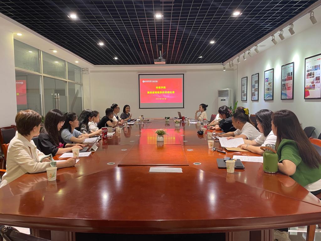 为贯彻落实立德树人根本任务,充分发挥课堂教学的主渠道作用,把思想教育贯穿人才培养体系,全面推进学院课程思政建设,提高课程育人实效、提升人才培养质量,7月3日下午传媒学院在汇知楼第四会议室举行了第四届“课程思政”讲课比赛。本次院赛由传媒学院副院长张荣花主持,各专业推荐11位教师现场进行了课程思政改革教学展示,特别邀请了校级课程思政教学名师、校级课程思政优质示范课负责人尚勇;陕西高校思政课教师“大练兵”课程思政教学能手房宁;省级线下一流课程负责人、校级课程思政示范课负责人范瑞婵担任评委。