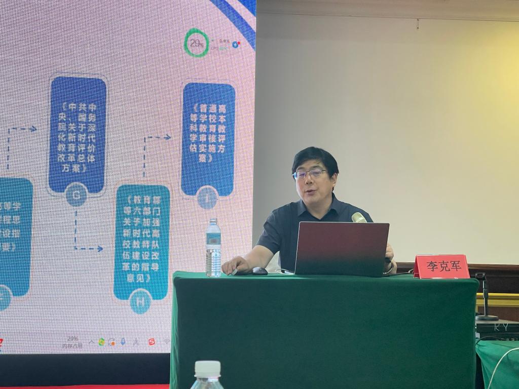 李克军教授结合多年的教务管理及教师教学管理经验,现场进行了主题为《教务管理创新与教师发展中心高质量发展的实践探索》的培训,他通过八个方面详细讲述了教学管理创新的主要内容,分别为理念先导、顶层设计;制度建设、体系构建;内部治理、强化管理;质量意识、质量文化;双万计划、建优建特;评估认证、以评定向;资源建设、数字转型;教学改革、开拓创新。李克军教授以河北民族师范学院教师教学发展中心为例,分享了教师教学发展中心建设的顶层设计、体系建设及建设成果。