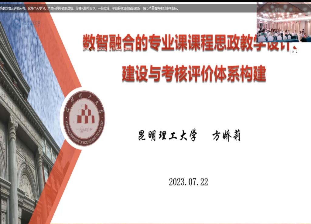 昆明理工大学的方娇莉老师主要讲述了课程思政的教学设计、考核评价体系等方面内容,分享大量的教学思路、教学图片,结合具体案例对教学设计进行详细讲解,为高校教师们的课程建设拓宽了思路。