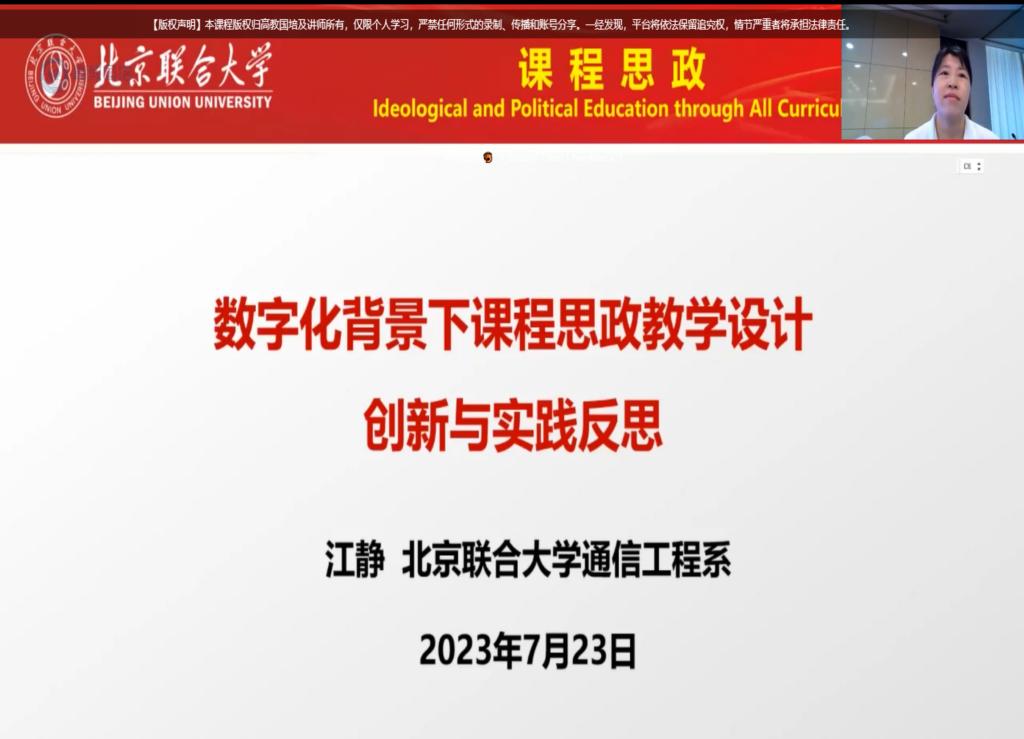 依托数字化资源建设全面推进课程思政教学能力提升研修班是以数字化资源建设为基础,聚焦数字中国建设背景下的课程思政设计,培养教师的数字素养和数字能力,掌握数字化技能和工具。此次培训目的是全面推进高校教师对数字化工具和技能的掌握以及提高教师利用数字化工具设计课程思政的能力。2023年7月22日至7月23日,传媒学院播音与主持艺术专业五位骨干教师肖雪菁、刘博、屈阳、吕玮、顾雪原,参加了高教国培(北京)教育科技研究院主办的线上依托数字化资源建设全面推进课程思政教学能力提升研修班。