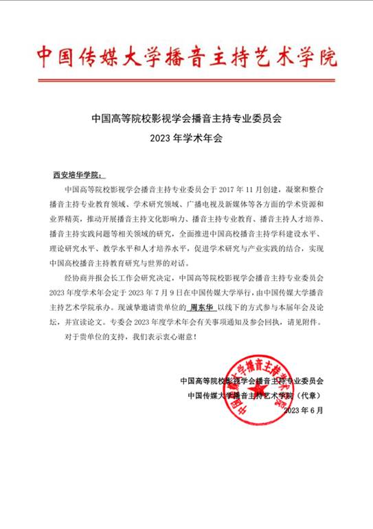 为促进全国播音主持专业领域的交流与合作,推动播音主持教育和实践的规范化、现代化、国际化与前沿化,服务全国播音主持高等教育的教育教学与学术研讨,2023年7月9日,中国高等院校影视学会播音主持专业委员会2023年学术年会在中国传媒大学举办,西安培华学院传媒学院播音与主持艺术学科带头人周东华教授受邀参会。