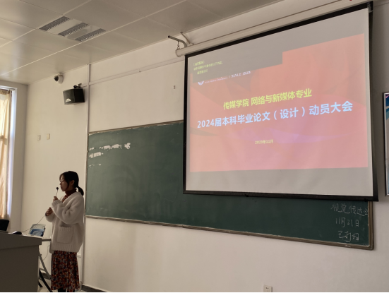 为顺利推进网络与新媒体专业2024届本科毕业生论文(设计)工作,11月21日下午网络与新媒体专业在6405教室召开了2024届本科毕业论文(设计)动员大会。网络与新媒体专业带头人杜萍、新闻传播系主任童瑾、新闻传播系副主任谷艺萌、网络与新媒体专业毕业论文指导教师以及2024届网新全体学生参加了会议。