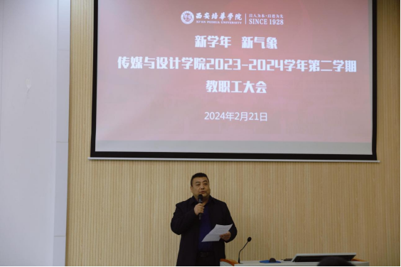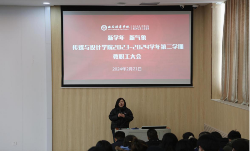 新学年新气象,2月21日上午,传媒与设计学院在汇知楼3505召开了2023-2024学年第二学期教职工大会,学院全体教职工参加了此次会议,会议由副院长张荣花主持。