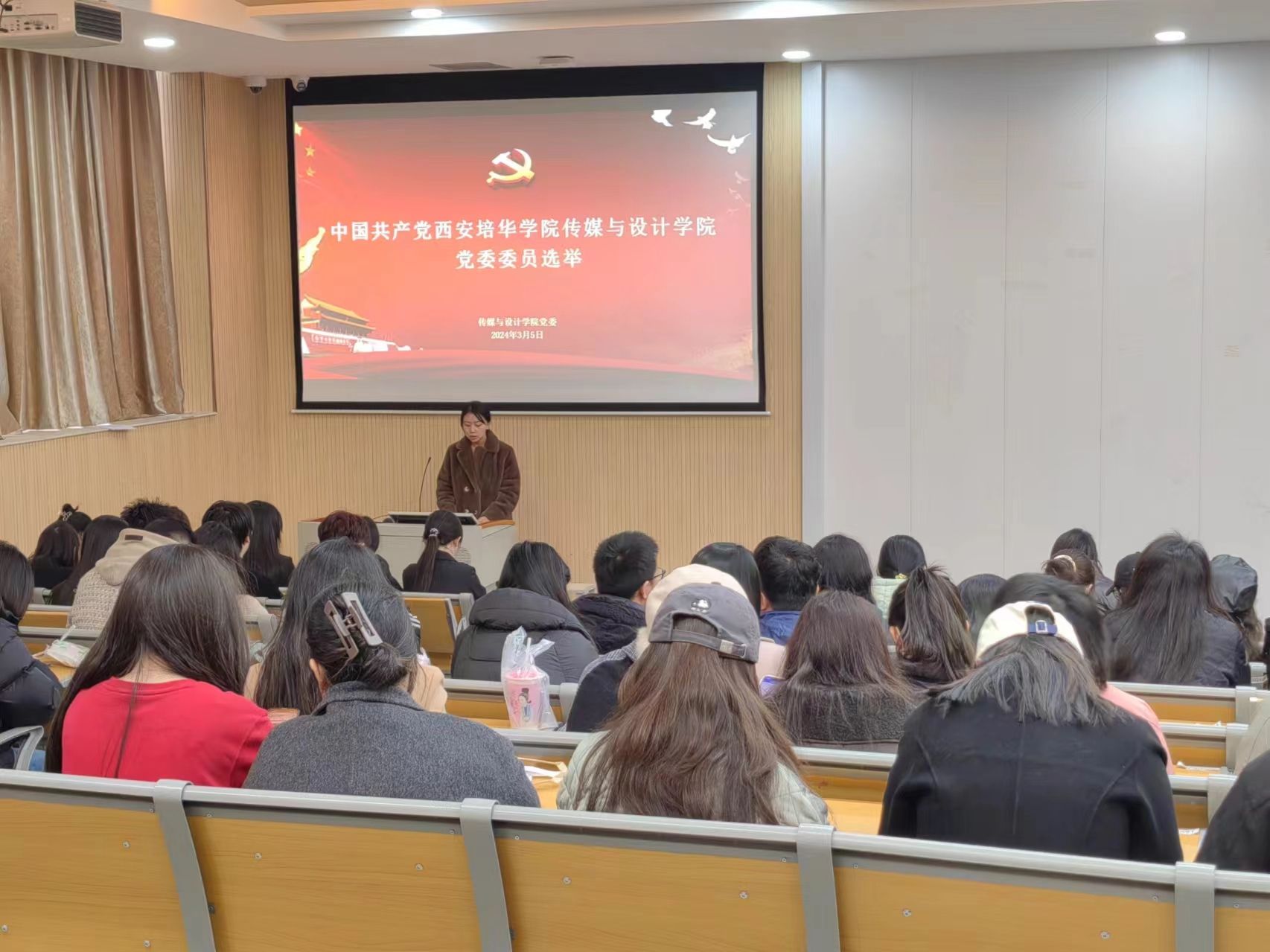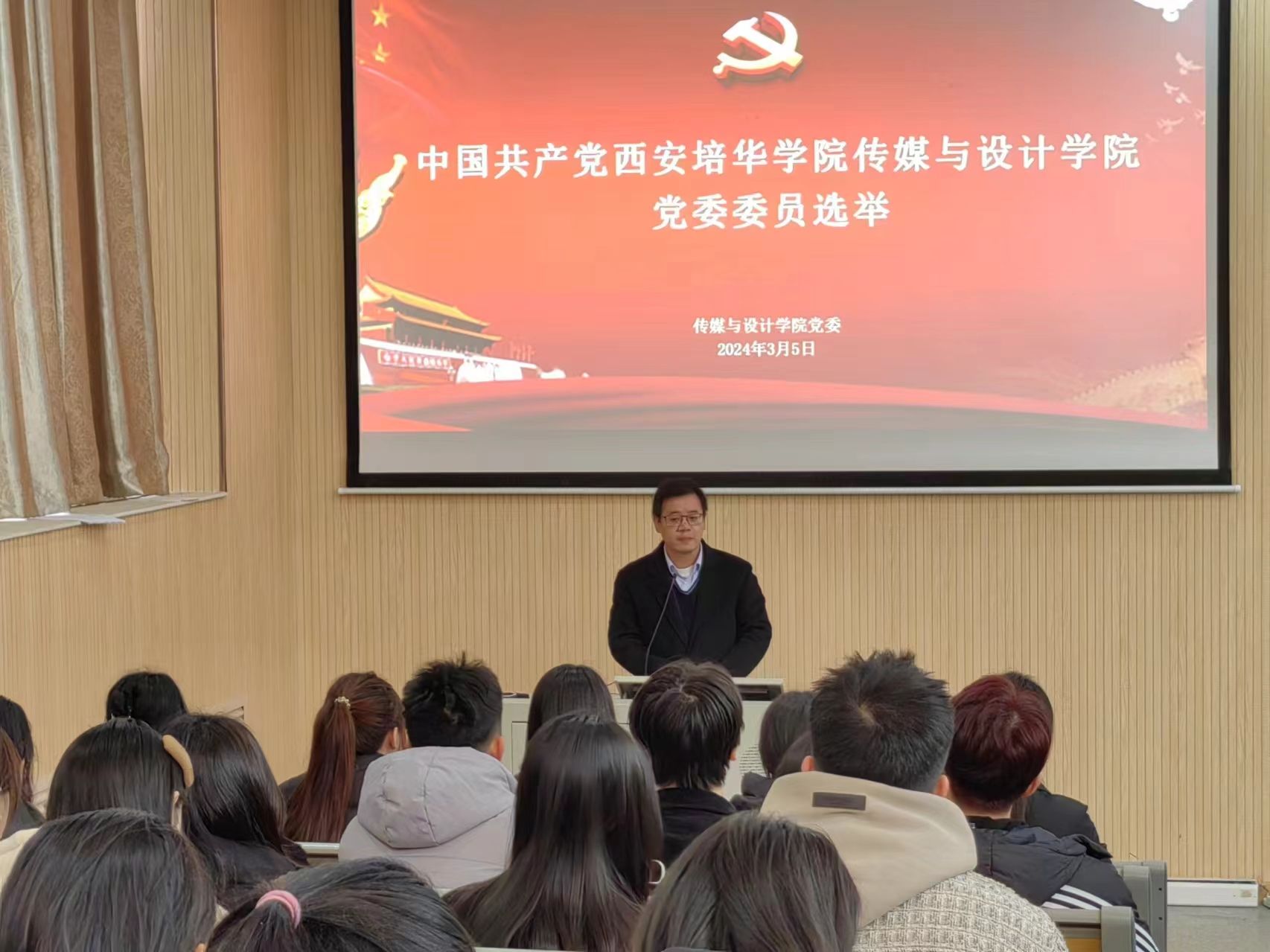 3月5日中午,传媒与设计学院第一届党委委员选举大会在育英楼3507召开,学院全体师生党员参加大会,选举大会由党委书记王飞同志主持。
