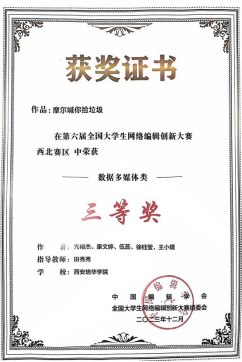 由我院新闻与传播系田秀秀老师的指导的王雪萌创作的作品《宋代点茶云体验》、亢裕杰、康文婷、伍蕊、徐钰莹、王小婕团队创作的《摩尔喊你捡垃圾》获得西北赛区数据多媒体类三等奖。