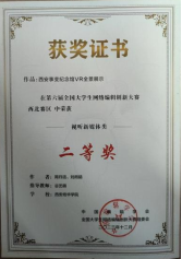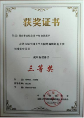 在我院新闻与传播系谷艺萌老师的指导下,周丹语、王雨晴团队创作的项目《西安事变纪念馆VR全景展示》获得了西北赛区二等奖,并报送全国参赛,在全国赛中荣获视听媒体类三等奖。该项目以VR新媒体技术与传统红色故事相结合,探索“VR+红色故事”的契合点,深入挖掘西安事变纪念馆背后的红色文化底蕴,制作VR全景视频,进行红色故事的讲述与传播。此外,谷艺萌老师的指导的宋承泽、田宇、郑阳团队创作的《小虎科普:行书》获得西北赛区视听媒体类优秀奖。