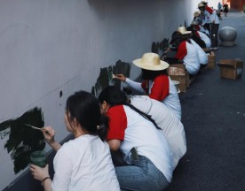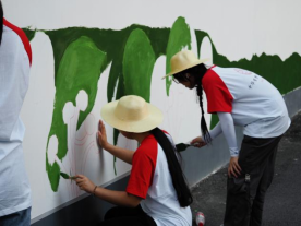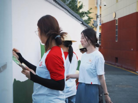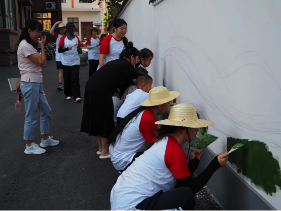 随后,实践队成员有条不紊地开始墙绘创作。测量、打底稿、调颜料、上色,大家分工明确,通力合作。本次墙绘分两个主题:一是快乐童年,二是文明社区。快乐童年串联起儿童生活场景,希望社区的小朋友通过画中场景培养积极的生活和学习习惯,健康快乐成长。文明社区主题墙绘将社会主义核心价值观融入图画场景,推动移风易俗,倡导居民合力建设文明和谐的社区。