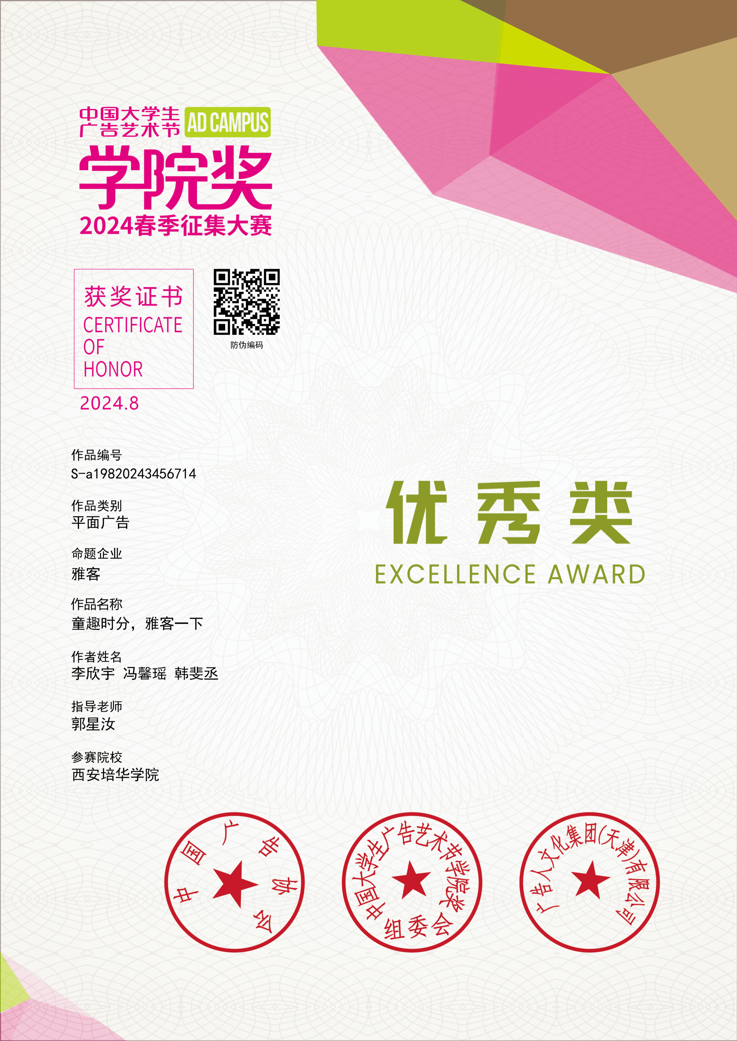 中国大学生广告艺术节学院奖(以下简称“学院奖”)是全国性的大学生广告专业奖项,学院奖始创于1999年,历经24年沿革,活动覆盖全国23个省、4个直辖市、5个自治区、2个特别行政区以及海外的共计1830所高校的5309个院系,每年有超过150万名师生直接参赛,收到来自全国各高校学子的40多万件创意作品。在全国各高等院校中深入人心,其影响已从高校延伸至广告行业,成为行业遴选人才,企业获取新鲜创意,品牌探索年轻化的重要途径。本次参加学院奖比赛项目共计20个,其中获奖作品5项。