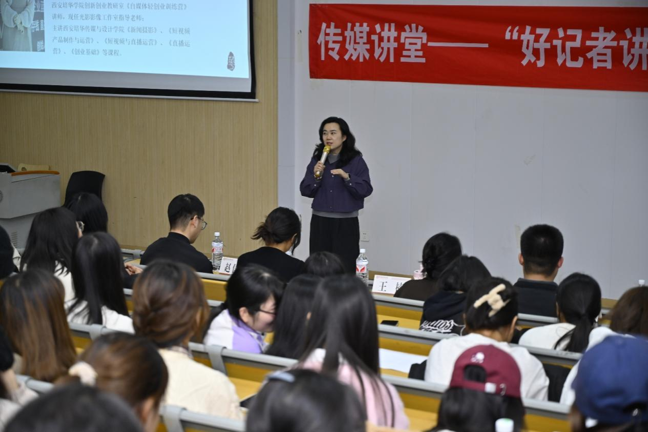 本次讲座由传媒与设计学院主办,光影工坊工作室社团承办,由传媒与设计学院教师王楠老师担任主持人。本次讲座特别邀请了西安广播电视台记者、两会记者、2023广播电视融媒体营销创新大赛暨公益作品征集大赛优秀奖获得者薛如梦作为主讲人,同时还邀请了嘉宾传媒与设计学院团委书记坚强,传媒与设计学院摄影课程组教师王雨晴、赵佳朦,光影工坊社团工作室创始人李鑫。本次讲座的主题是“新闻发现、新闻摄影、新闻选题、策划与写作”,薛如梦记者围绕其在新闻工作中如何获取新闻线索、如何进行新闻策划、如何摄制等进行详细讲解。