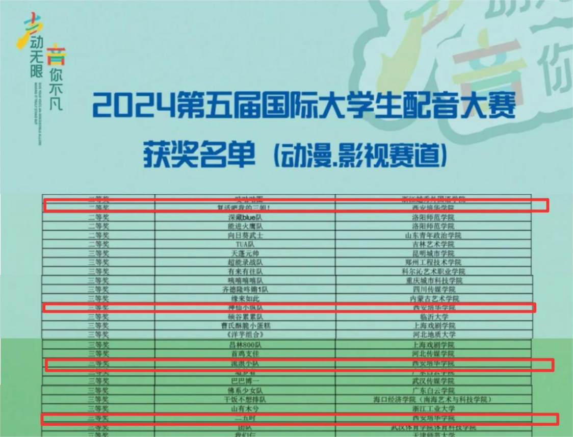 2024年11月21日至24日,由中国高等院校影视学会指导,浙江传媒学院和爱奇艺联合主办的2024年第五届国际大学生配音大赛暨柯桥多巴胺鉴湖嘉年华在浙江省绍兴市柯桥区隆重举行。西安培华学院传媒与设计学院播音与主持艺术专业学生武少雄、赵梓阳、张梓莹组成的团队“复活吧我的三姐!”荣获动漫组全国二等奖,王婧怡获广告片赛道全国二等奖,李锶昀、赵玉乐,蒋欢、王婧怡,杜墨宸组成的“神仙小纵队”荣获动漫组三等奖,黄培锋、宋超文组成的团队“二五时”和简可怡、李星毅组成的“流浪小队”荣获影视组三等奖,李心昕获得纪录片赛道全国三等奖,西安培华学院荣获最佳组织奖。陈连龙、尚勇、曲少为荣获秀指导教师奖,陈连龙、曲少为老师带队参赛与领奖。