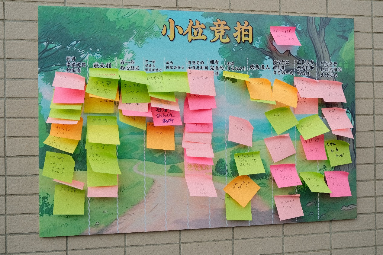 同学们还将自己的梦想和目标写在纸条上,贴在象征“希望与远方”的漂流瓶上,再通过人生竞拍的方式,寄托对未来的期许。