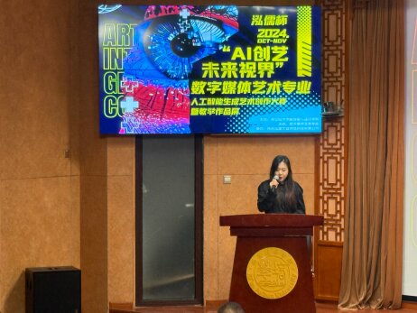 活动中,传媒与设计学院常务副院长徐莹发表了致辞。她表示,本次大赛是数字媒体艺术专业教学改革和创新的生动实践,充分体现了人工智能对艺术创作方式和理念的深远影响。通过大赛,学生们深刻体验了AI技术的创作潜力,激发了对数字艺术与技术融合的兴趣与探索精神。徐院长还强调,学院将继续加大对数字创意与人工智能结合的投入,鼓励学生大胆创新,推动数字艺术的持续发展。