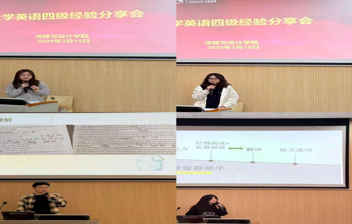 随后,四位高分通过四级考试的学生代表依次登台,结合自身备考经历,为学弟学妹们传授实用技巧。戏剧影视文学专业张佳琳同学提出"碎片化词库记忆法",建议利用手机APP攻克高频词汇;孙彦楠同学针对阅读理解提出“关键词定位+逻辑分析”双轨策略,强调通过限时训练提升答题效率;环境与设计专业王玉盛同学强调了积累传统文化与热点话题对于翻译的重要性;网络与新媒体专业陈璐同学则总结“写作模板升级技巧”,指导如何将基础句式转化为高分表达。鲜活案例引发强烈共鸣。