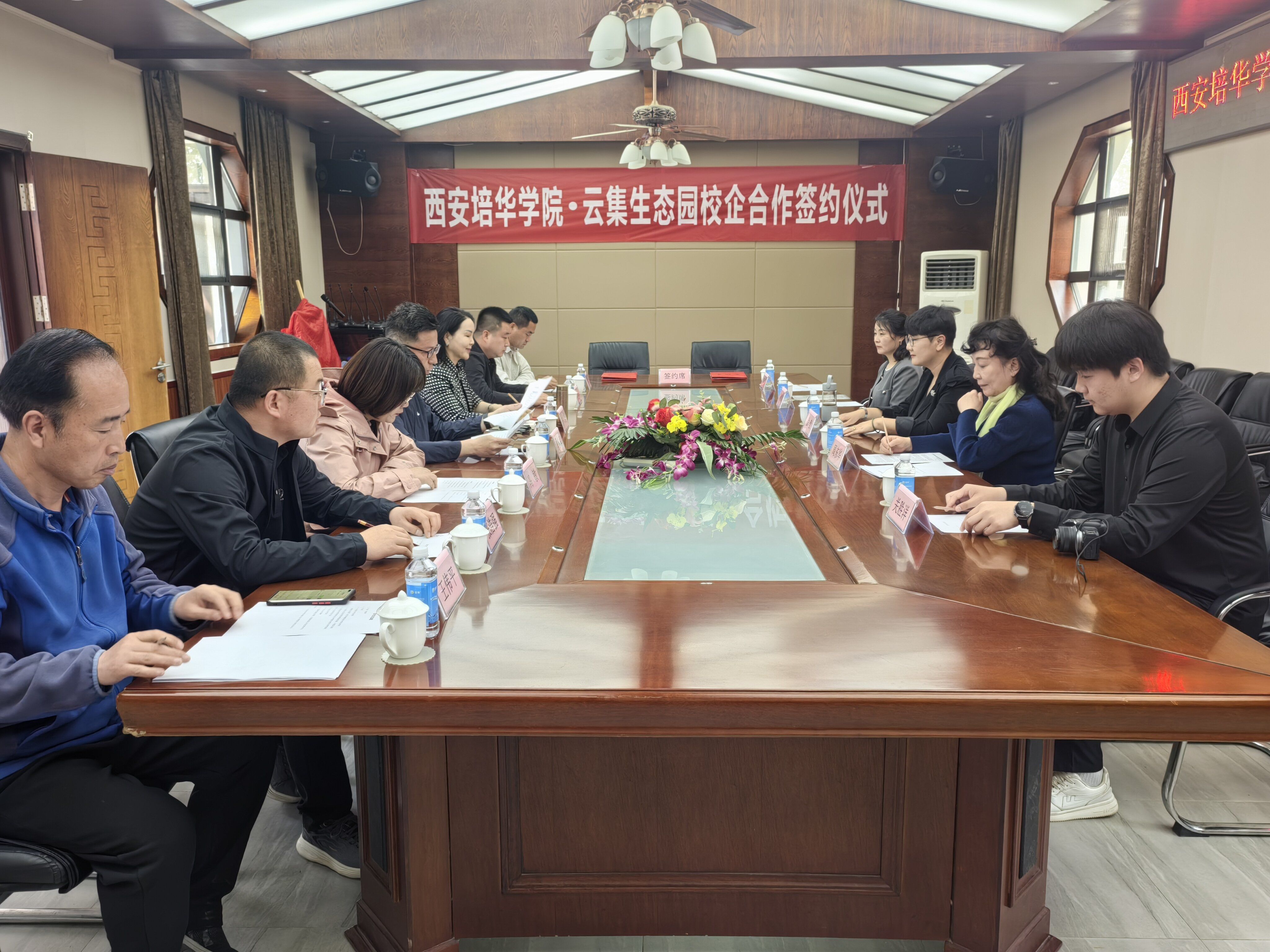 西安培华学院传媒与设计学院常务副院长徐莹、播音与主持艺术专业学科带头人周东华教授、学院综合办公室主任刘维娜及学院负责校企合作基地工作李芳老师,西安蓝溪科技投资控股有限公司副总经理、陕西云集盘龙酒业有限公司总经理李萍、陕西云集文化旅游发展有限公司总经理李睿军及陕西云集农业科技有限责任公司总经理王胜利等企业领导参加了签约仪式。