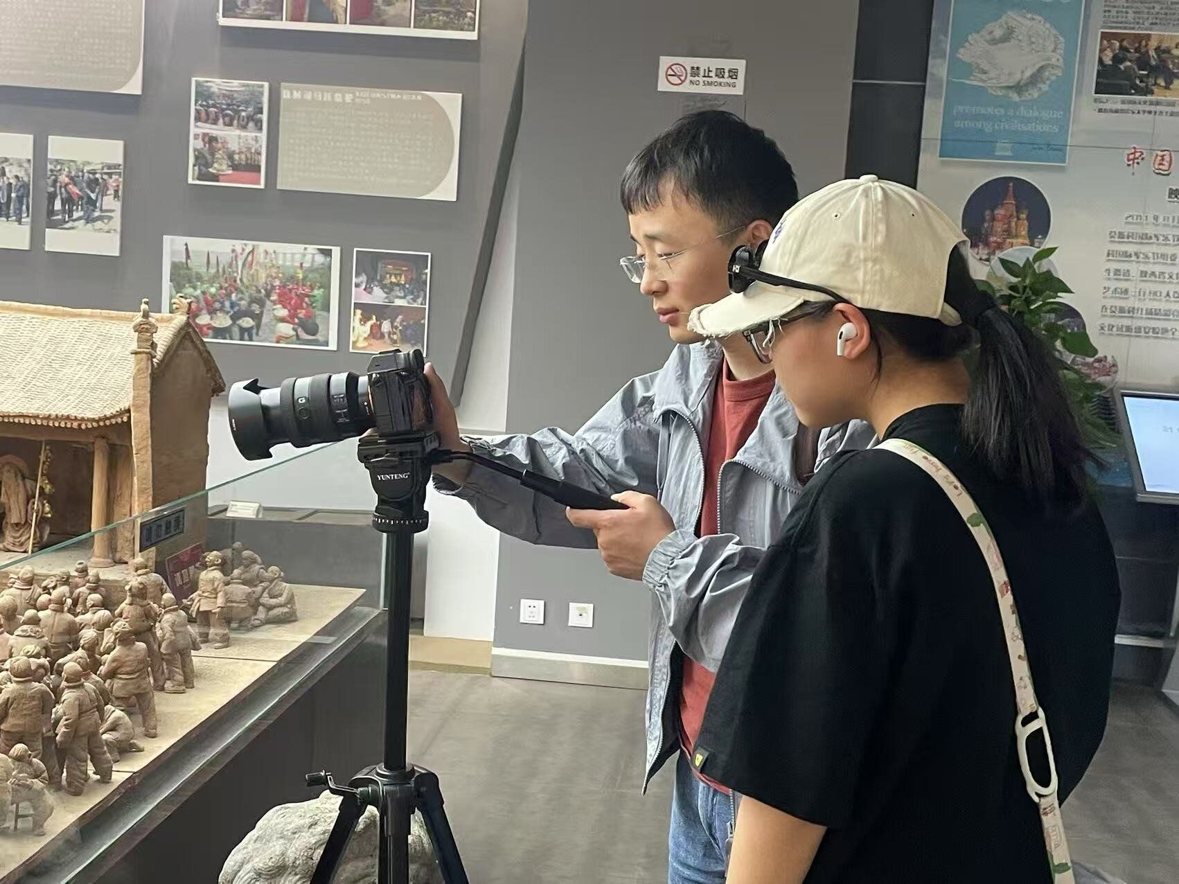 4 23 日上午,师生参观渭南非物质文化遗产传习馆,深入了解剪纸、皮影戏、泥塑等技艺。学生分组进行短视频创作,教师巡回指导,强调用特写镜头突出非遗技艺细节,注重文化内涵表达。在创作过程中,学生们不仅关注非遗技艺的表现手法,更深入挖掘其背后的文化价值。他们与传承人交流,了解技艺的历史渊源、制作流程以及面临的传承困境,将这些元素融入短视频创作中,使作品更具深度和感染力。