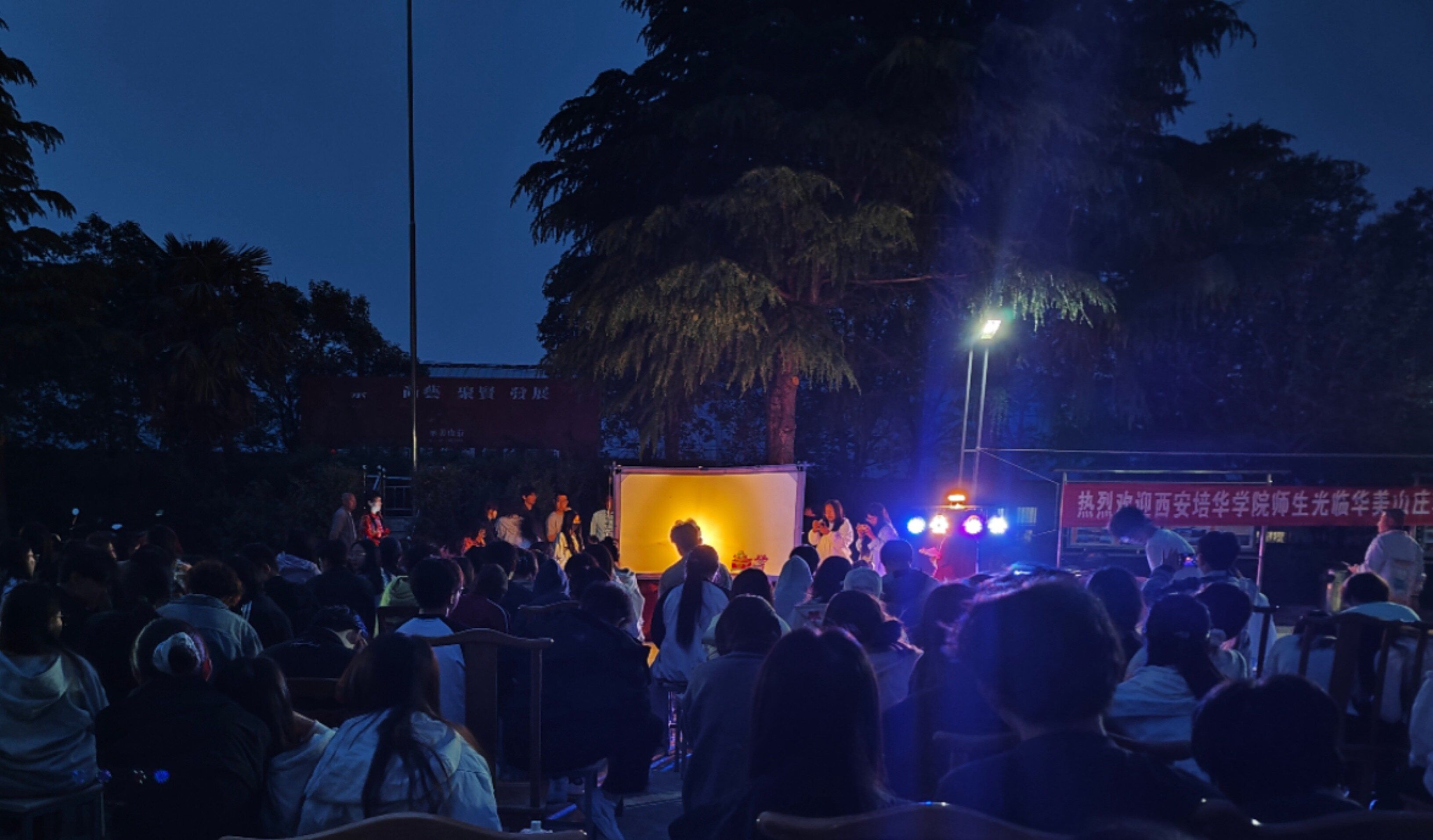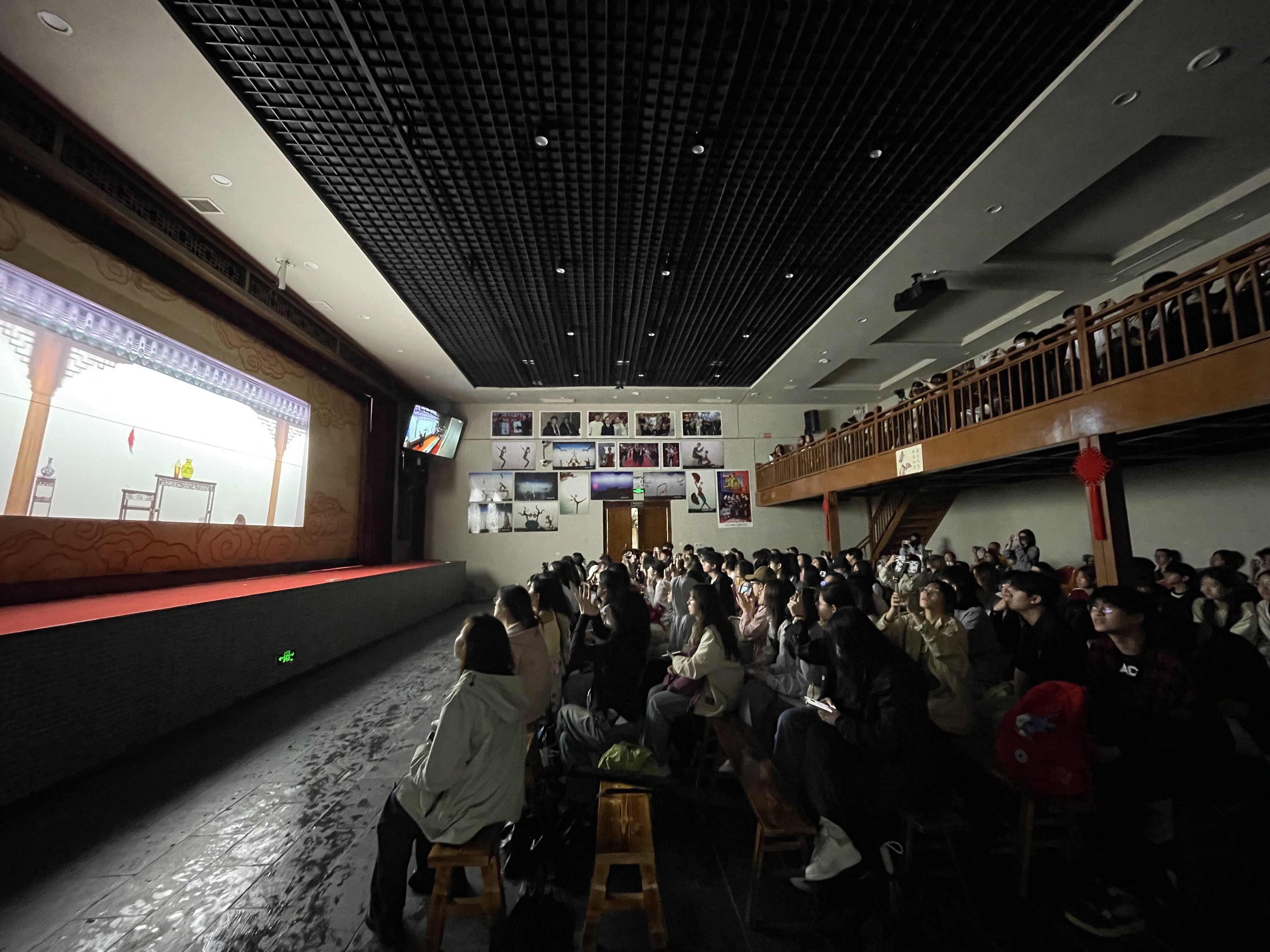 4 22 日,师生在西岳庙和仙峪景区进行拍摄实践。学生围绕古建细节和自然风光选题,学习在不同光线条件下进行构图和光影运用。教师现场指导如何利用补光设备优化画面效果,鼓励学生尝试不同拍摄角度,将历史厚重感与现代审美相结合。在仙峪景区,学生面对复杂的自然光线条件,积极探索如何利用现有设备优化拍摄效果。他们尝试使用反光板、补光灯等工具调整光比,确保画面质量。各小组分工协作,有的负责寻找最佳拍摄点,有的专注于设备操作,有的则实时查看画面效果并提出调整建议,现场氛围忙碌而有序。晚上观看华阴老腔表演,感受传统戏剧舞台氛围。