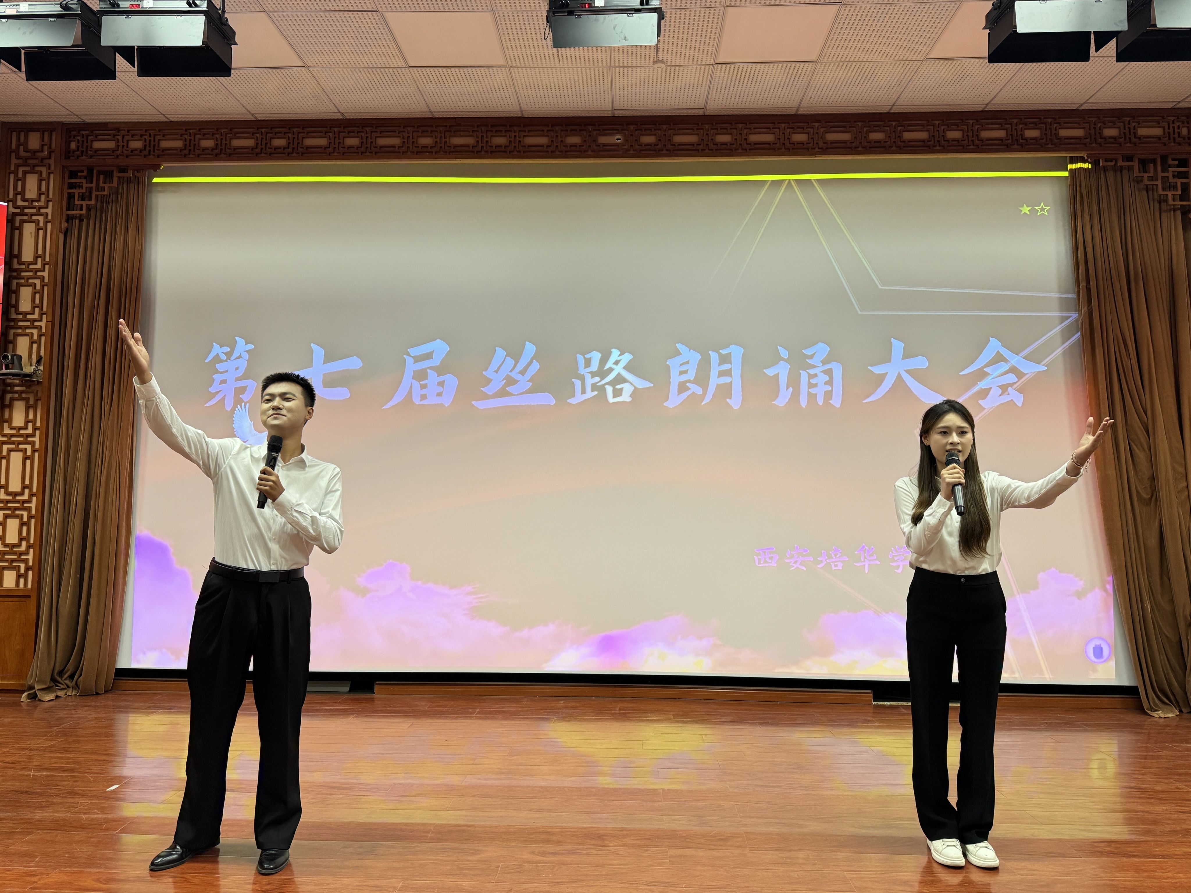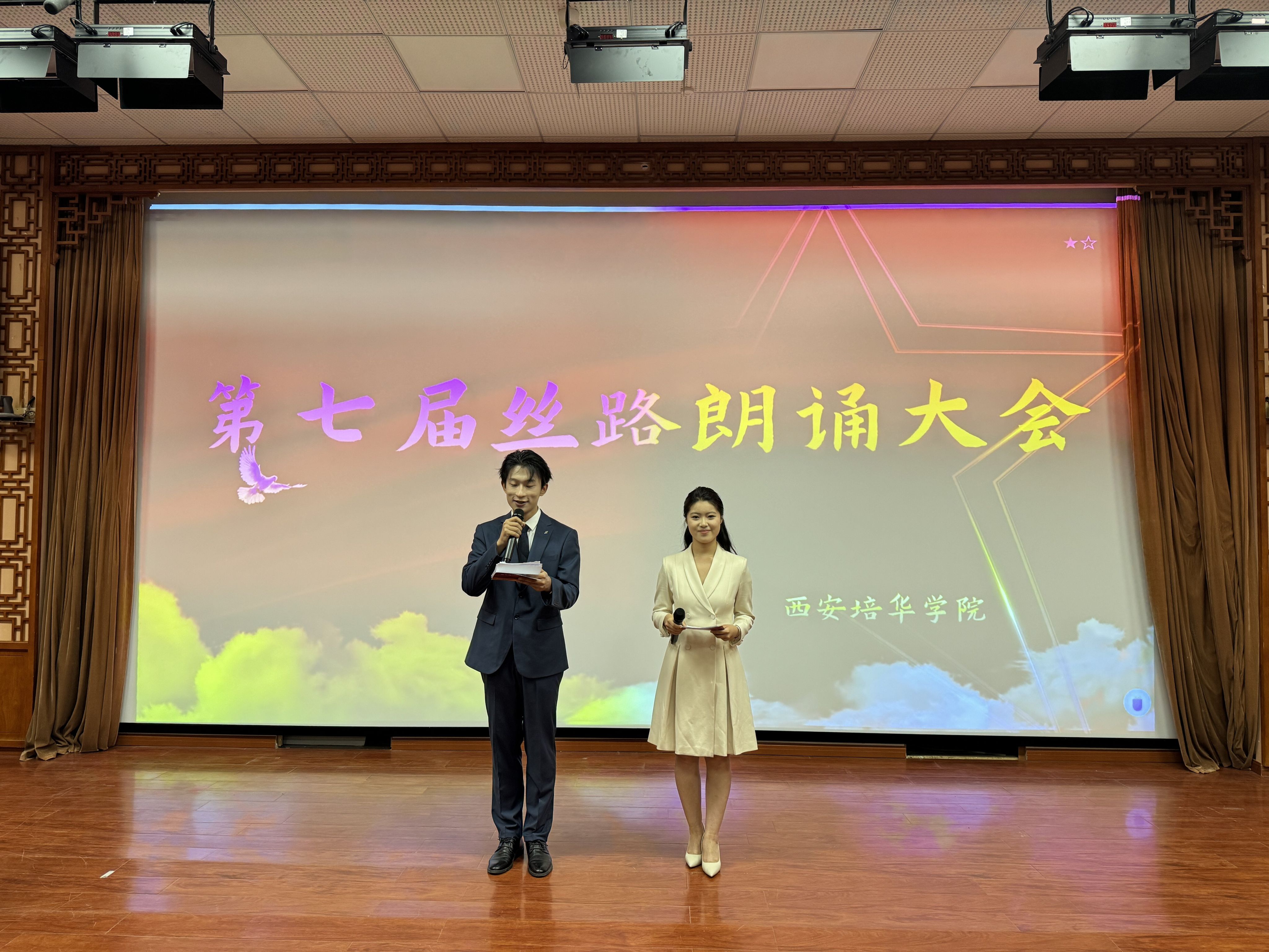 丝路传音诵经典,培华学子展新声。西安培华学院依托其深厚的文化底蕴及其传媒学科优势,为鼓励我校学子们勇于在舞台上展现艺术风采,2025年5月8日,于西安培华学院汇知楼—6111隆重举办第七届丝路朗诵大会西安培华学院赛区比赛,并顺利举行,取得圆满成功。担任本次比赛的评委老师有:西安培华学院播音与主持艺术系主任尚勇老师、播音与主持艺术专业教师买丽颖老师、黑梦奇老师、张雨声老师、刘玥老师。本次比赛由西安培华学院播音与主持艺术专业主办,分为朗诵赛道和配音赛道,鼓励全校学生积极参与,最终在赛场上见证了传媒与设计学院选手、马克思主义学院选手、人文与国际教育学院选手和智能科学与工程学院选手的卓越风采。本次比赛由播音与主持艺术专业学生隋佳煦、孙兴宇主持。