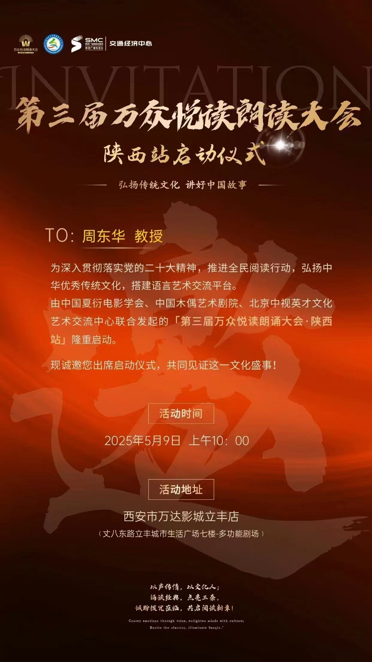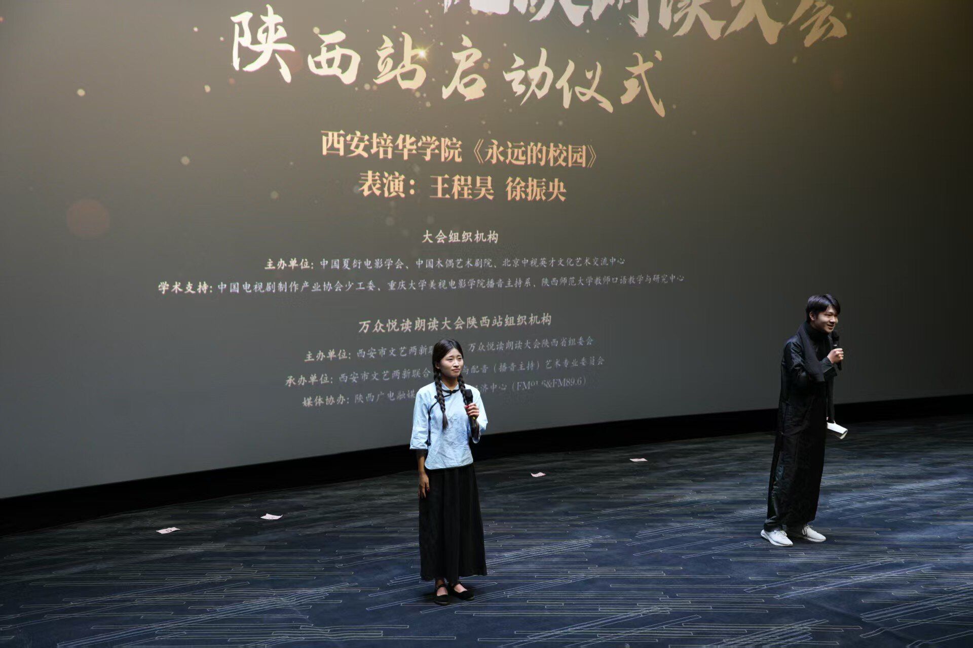 2025年5月9日上午10点,由中国电视剧制作产业协会少年儿童工作委员会指导,北京中华文化促进会、中国国际民间组织合作促进会家长与教师合作管理委员会,西安市文艺两会委员会联合主办的万众悦读朗诵大会陕西赛区开幕式在西安万达影城立丰店隆重举行。西安培华学院传媒与设计学院播音与主持艺术专业带头人周东华教授担任总评委,播音与主持艺术2401英才班全体同学参加本次活动。
