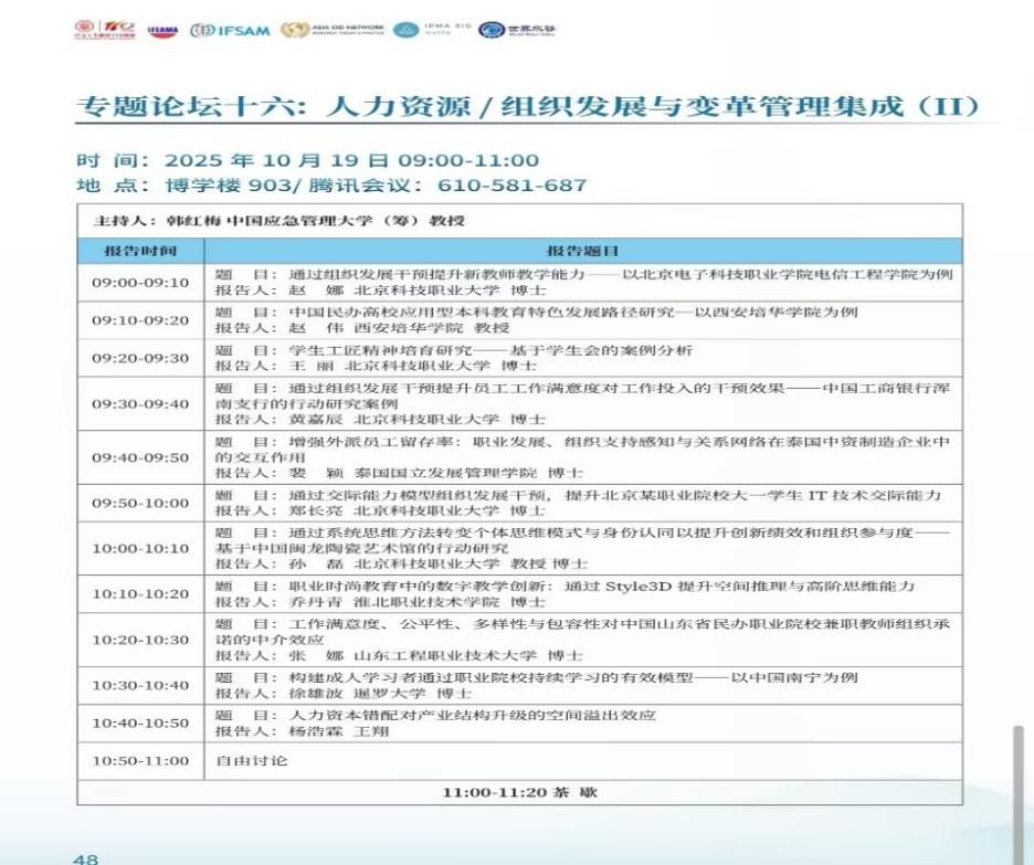 本次由河海大学商学院主办的亚洲组织发展国际研讨会于10月17-19日在南京举行,以"战略、可持续性与组织发展"为主题,吸引了包括新加坡国立大学、东京大学、首尔大学、清华大学等亚太地区顶尖高校的200余名学者参会。作为亚洲地区组织发展与高等教育创新领域的重要学术盛会,本届论坛首次设立"应用型高等教育特色发展"专题研讨板块,赵伟教授是该板块唯一受邀发表主题演讲的中国西部民办高校代表。