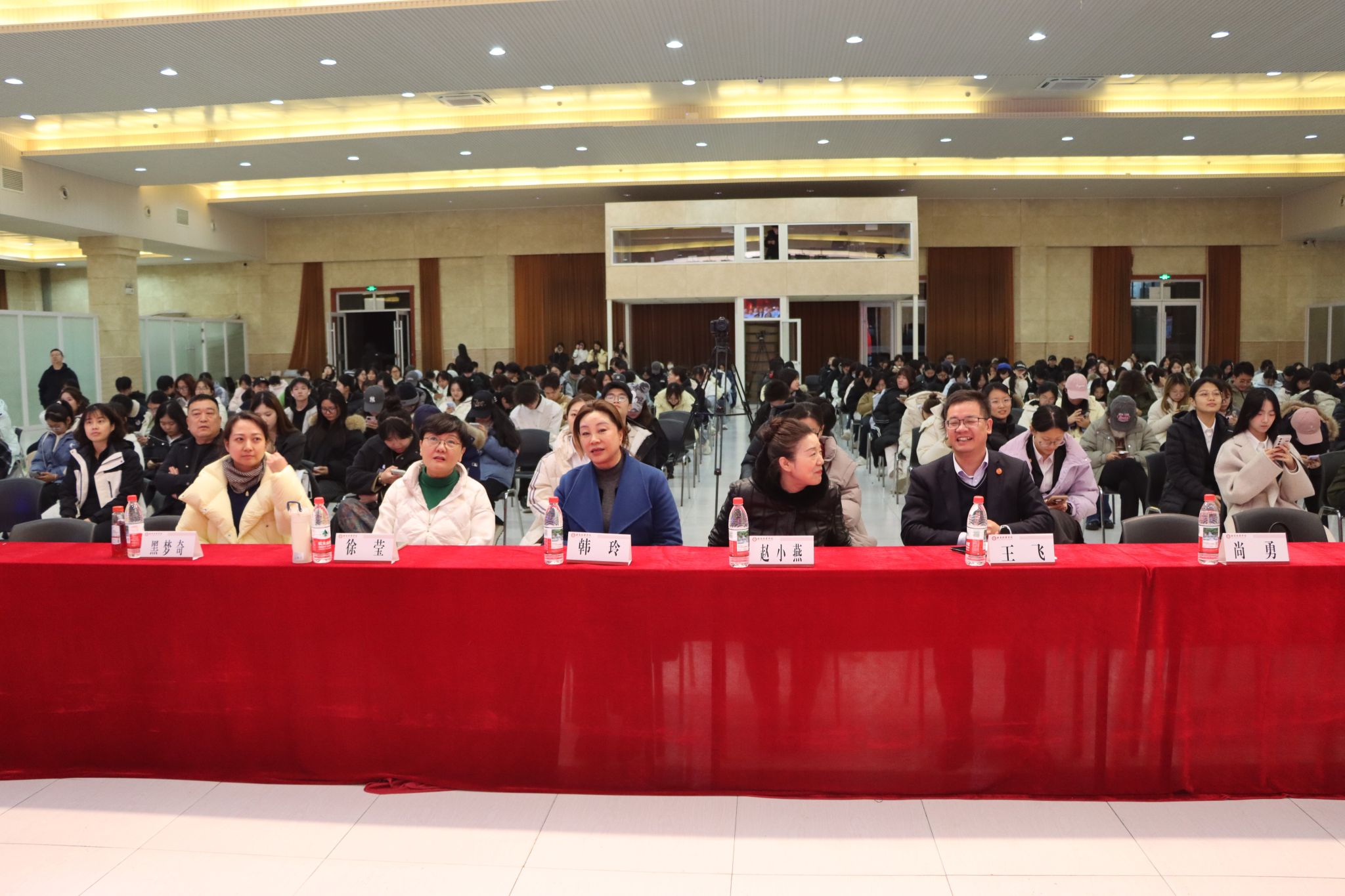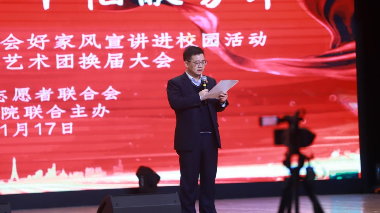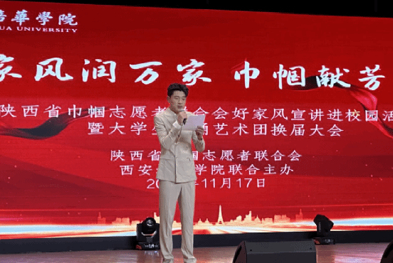 2025年11月17日19:00,西安培华学院大学生活动中心内灯火璀璨、暖意融融,“家风润万家,巾帼献芳华”陕西省巾帼志愿者联合会好家风宣讲进校园活动暨大学生朗诵艺术团换届大会在此隆重举行。省巾帼志愿者联合会韩玲会长、赵小燕副会长兼秘书长,西安培华学院传媒与设计学院常务副院长徐莹、党委书记兼行政副院长王飞,播音与主持艺术系主任尚勇,大学生朗诵艺术团负责人黑梦奇老师、大学生朗诵艺术团成员及学生代表齐聚一堂,共同见证青春使命的传承与家国情怀的绽放。