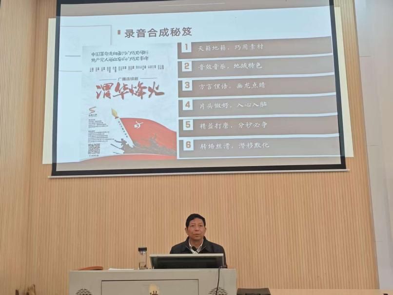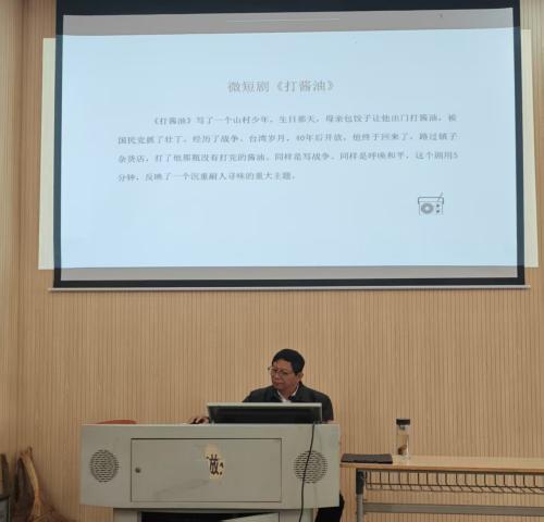 殷满仓老师围绕广播剧创作的核心要素展开系统讲解,从故事梗概构思、人物小传塑造到剧本对白打磨、场景转换设计,全方位拆解了广播剧从策划到落地的完整流程。专家以5分钟微短剧《打酱油》为例,深入剖析了如何用精炼叙事承载沉重主题——作品通过山村少年因打酱油被抓壮丁、四十年后终圆梦的故事,以小见大传递和平愿景,让在场学生直观感受到广播剧“以声传情、以小见大”的独特魅力。