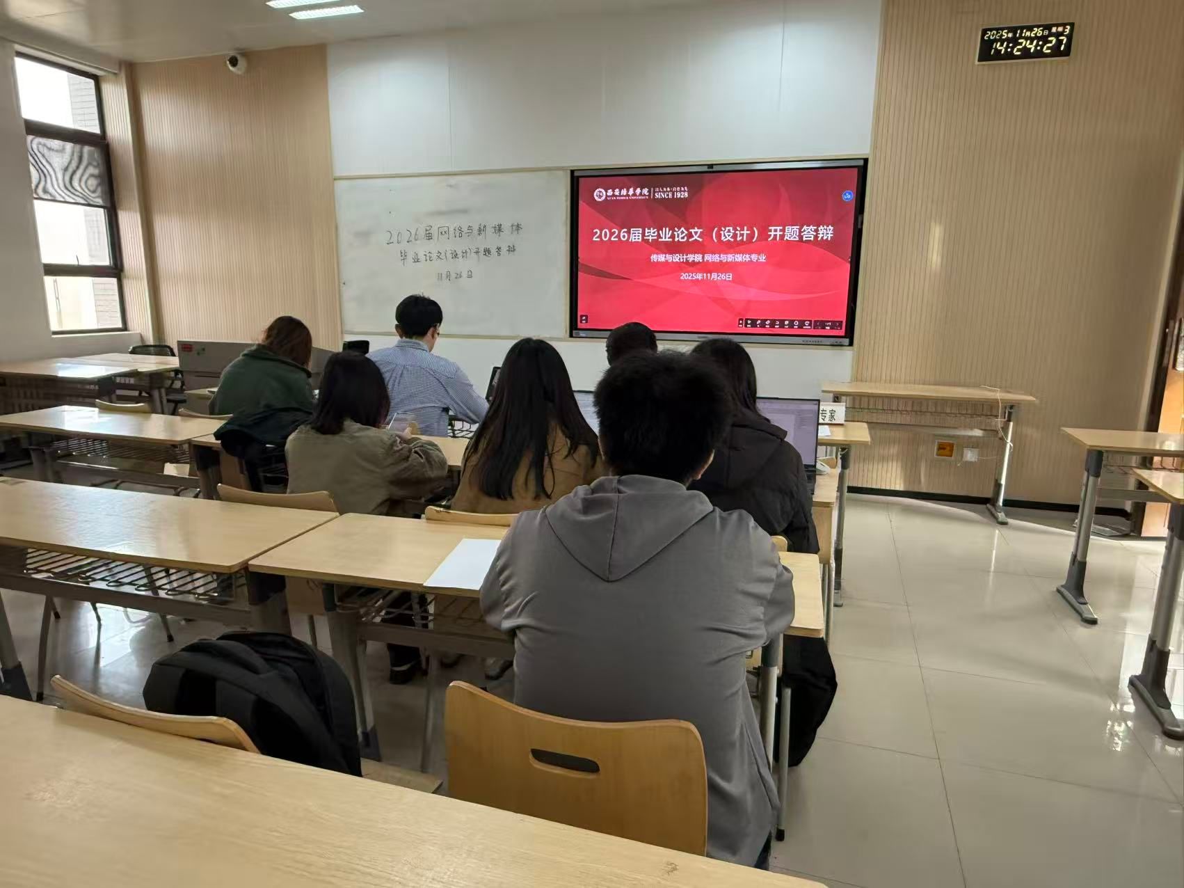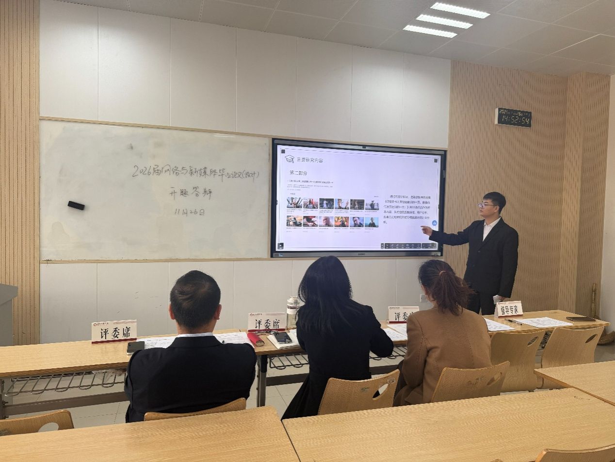 2025年11月26日下午14:30,网络与新媒体专业2026届本科毕业论文(设计)开题答辩在线上与线下同步顺利举行。本次答辩共分为四个小组,整体组织有序,流程规范,全面检验了学生的研究课题可行性和研究方法科学性。
