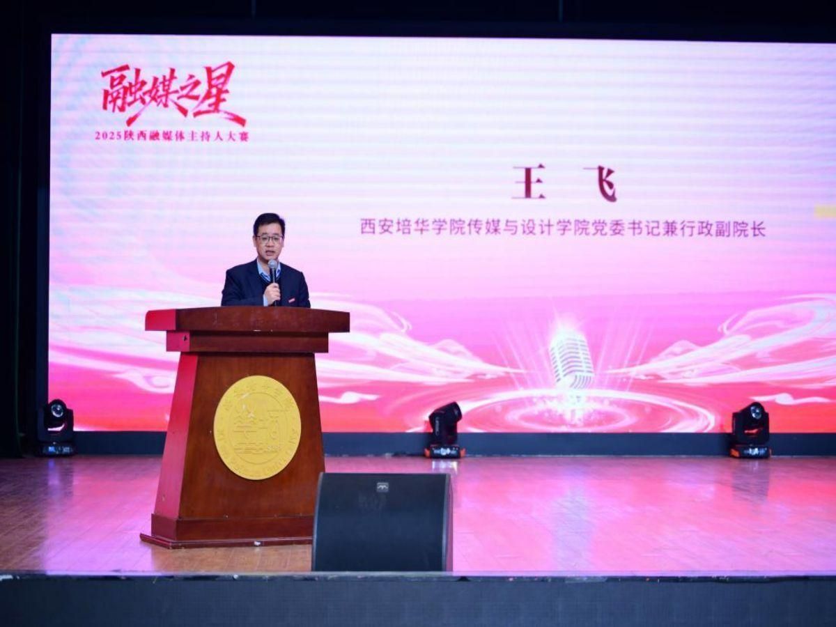 开幕式上,四位嘉宾先后登台致辞。王飞书记代表承办方对各位嘉宾、评委及参赛选手的到来表示热烈欢迎,介绍了西安培华学院传媒与设计学院的办学特色、播音与主持艺术专业的建设成果及人才培养理念,并预祝选手们赛出水平、赛出风格;李林秘书长从行业发展角度阐述了融媒体主持人才的核心素养与时代需求;西安培华学院学科带头人周东华老师讲述历经 97 年历程、播音与主持艺术专业发展 20 年承办融媒之星 2025 陕西融媒体主持人大赛复赛,呼应媒体融合新形态与主流媒体人才需求、舆论构建目标,预祝赛事圆满及选手取得佳绩。 徐杰副主席作为评审组组长,强调了大赛的公平公正原则,鼓励选手们充分展现个性与实力,在竞争中交流成长。