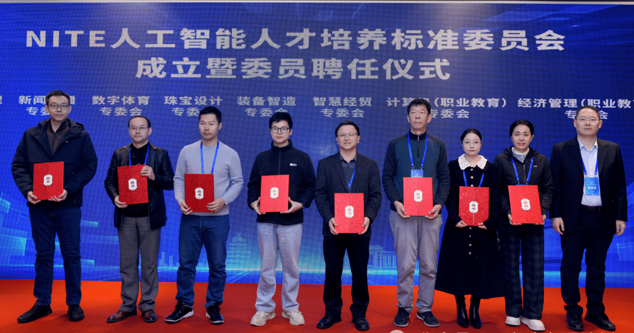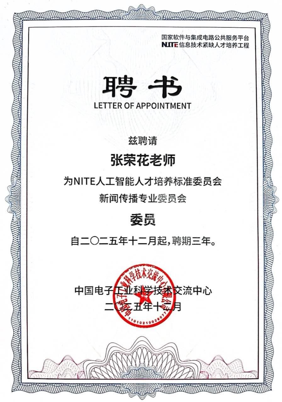 2025年,NITE人工智能人才培养标准委员会组建了计算机、智能体技术、智慧教育、影视传媒、数字文旅、法律、外语、文学、数字艺术、经济管理、新闻传播、数字体育(职业教育)、珠宝设计(职业教育)、装备制造(职业教育)、智慧经贸(职业教育)、计算机(职业教育)、经济管理(职业教育)在内的17个标准委员会。会上,举行了 NITE 人工智能人才培养标准委员会委员聘任仪式。我院副院长张荣花获聘获聘NITE人工智能人才培养标准委员会新闻传播专业委员会委员。