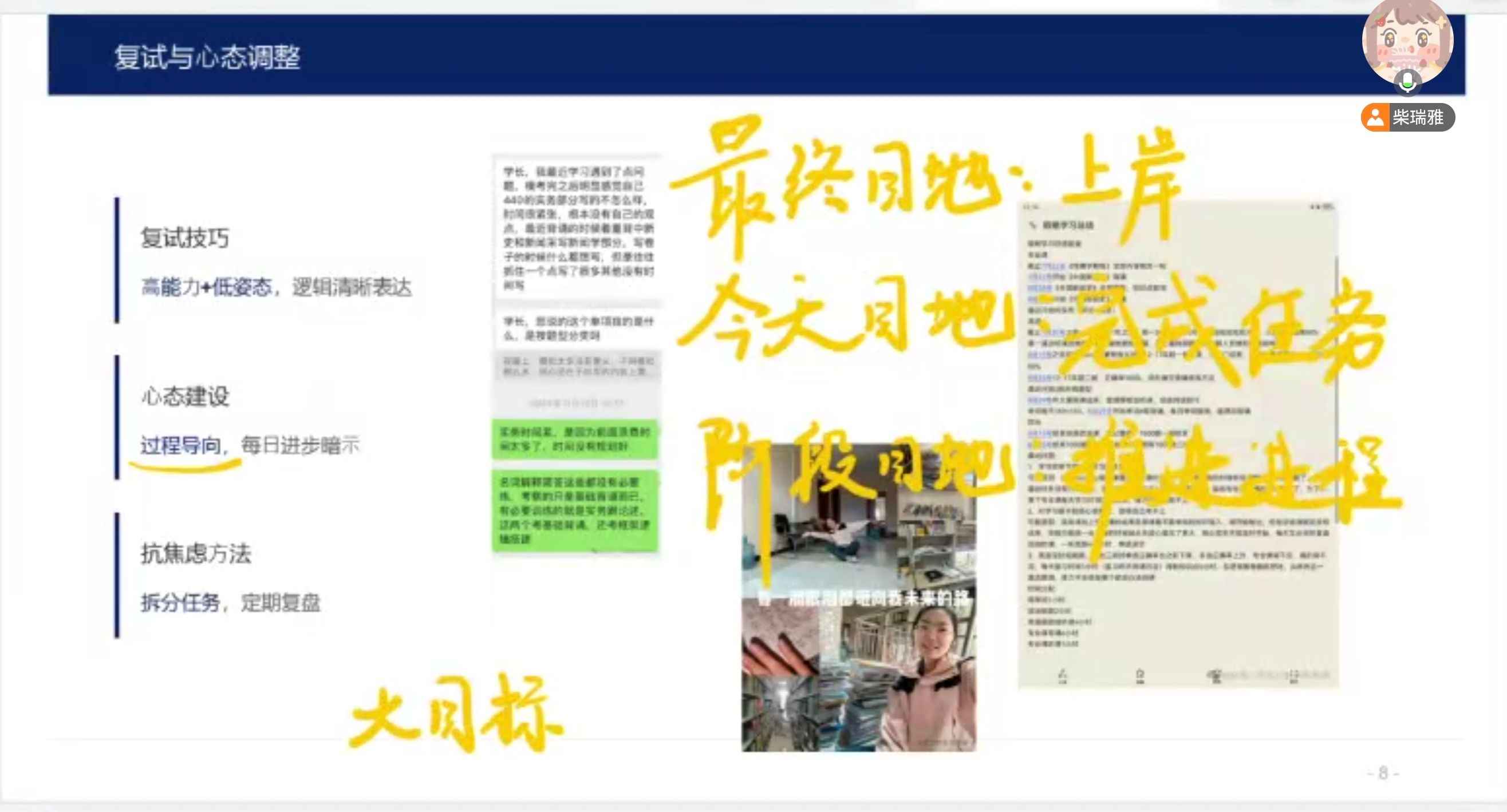 在漫长的备考过程中,心态调整同样至关重要。柴瑞雅学姐以“道阻且长,行则将至”这一格言激励学弟学妹,特别强调行动的重要性——无论备考之路多么坎坷,只要坚持不懈地前行,终将实现目标。