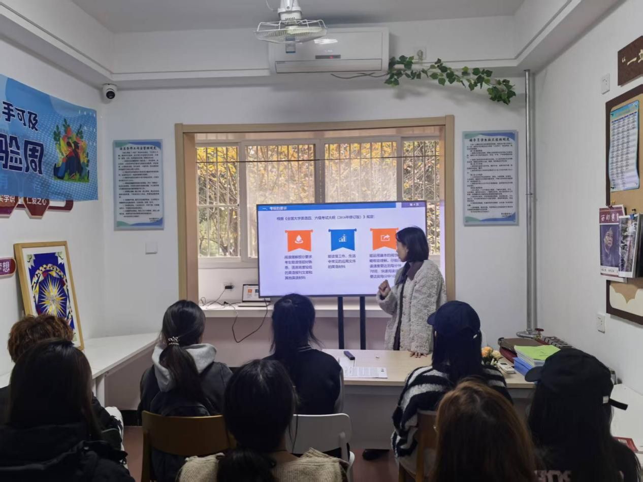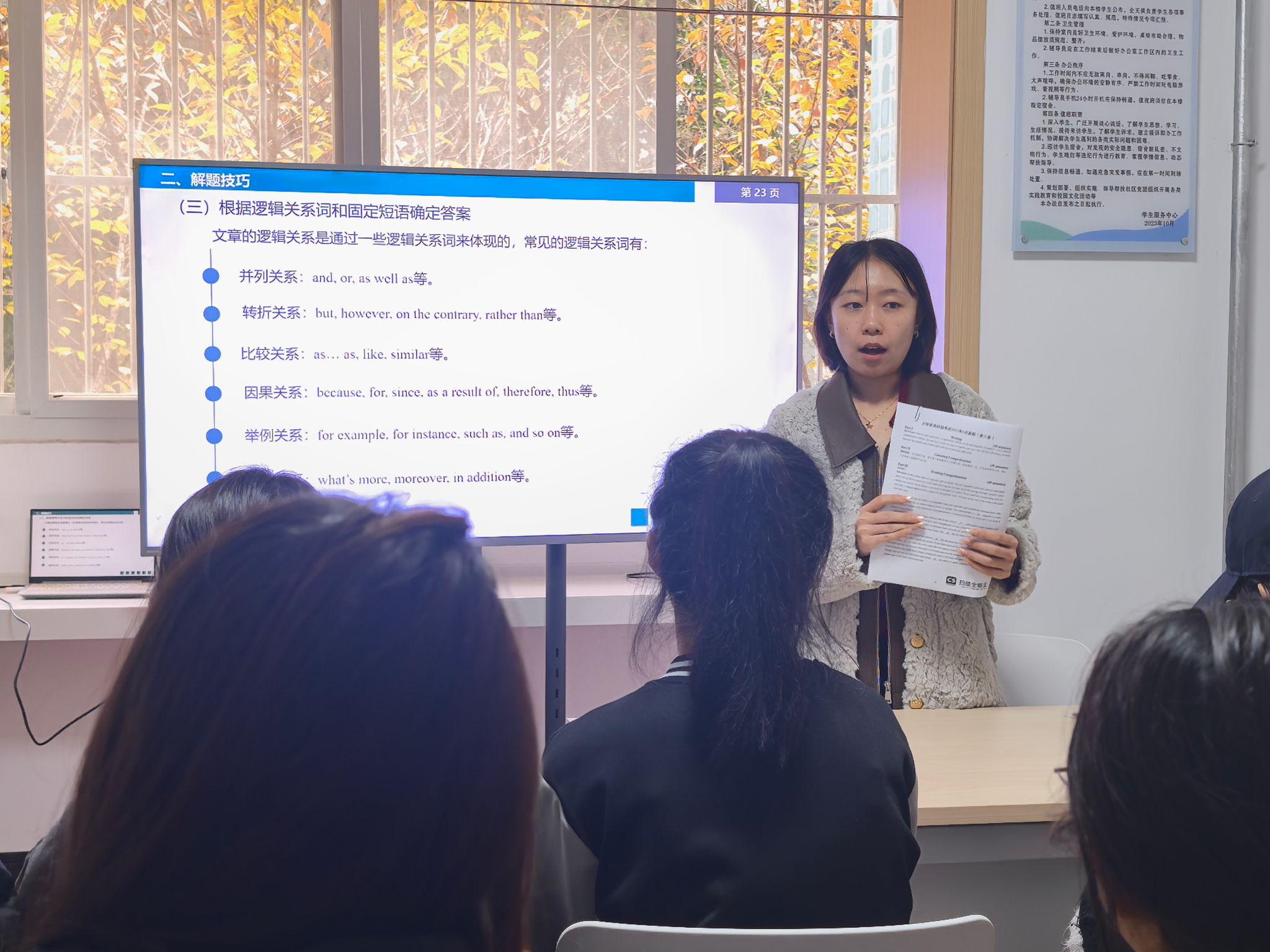 秦佳宁老师围绕四级中的阅读题型,通过讲解单词词性为同学们提供一种便捷的记忆单词和解答题目的方法。她先从常见词性入手,详细剖析了不同词性在句子中的成分和作用,让同学们清晰了解单词在特定语境下的意义。接着,结合历年四级阅读真题,现场演示如何根据词性判断选项,快速定位答案。同学们纷纷表示,这种记忆单词和解题的方法新颖独特,不仅加深了对单词的理解,还大大提高了答题效率。
