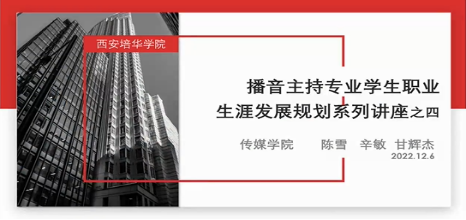为进一步健全高校大学生职业生涯规划与就业指导体系,系统推进学校学生职业生涯教育内涵发展。12月6日,西安培华学院传媒学院播音系在线上举办了2021级学生第四次职业规划课程,播音与主持艺术专业2021级学生全员参加。