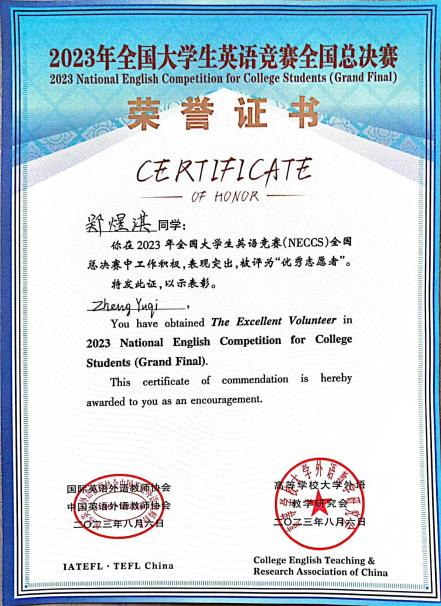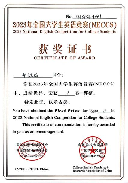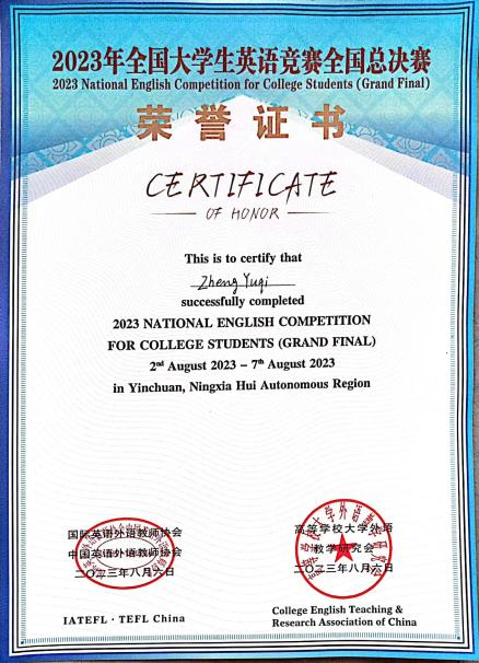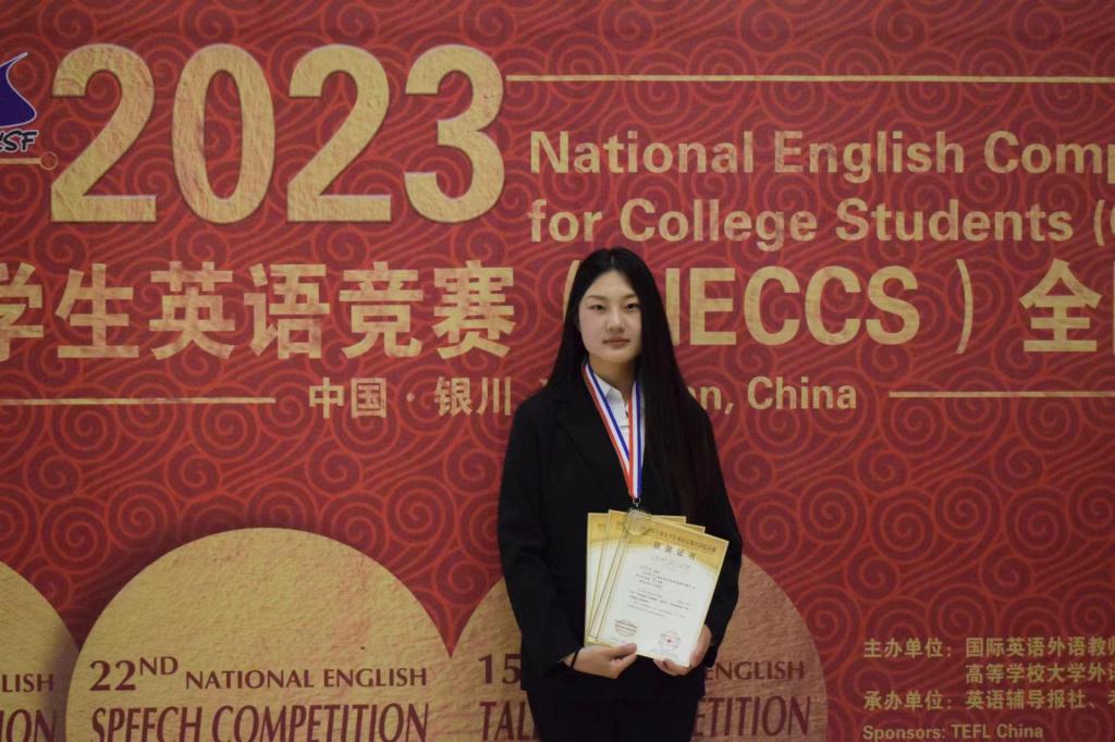 每天清晨路过至格物楼前总会听到郎朗的读书声,走近看原来是在朗读英文美文。有一位女生总是耐心的给学弟学妹们纠正英语的发音,并提出建议。她就是郑煜淇。在专业上从大一学年开始他一直坚持在早上六点半钟来到格物楼前进行发音练习,日复一日,风雨无阻。而这份坚持也为后来她在比赛中取得成绩做了铺垫。无论是学习还是工作中她总是很积极的那一个,会的东西她会认真做,不会的东西她会认真学。就是这份热爱在2023年8月的时候,使她得到了去银川参加全国大学生英语竞赛全国总决赛的机会。