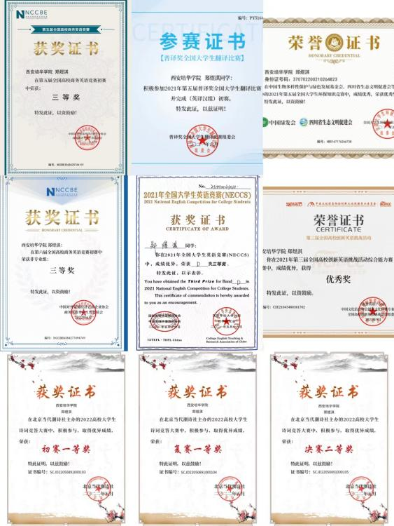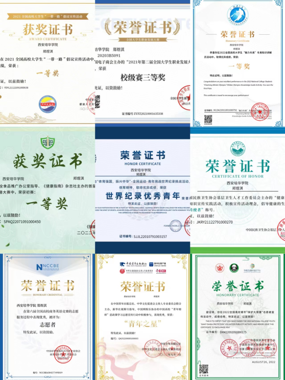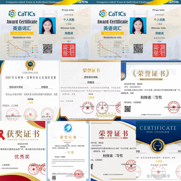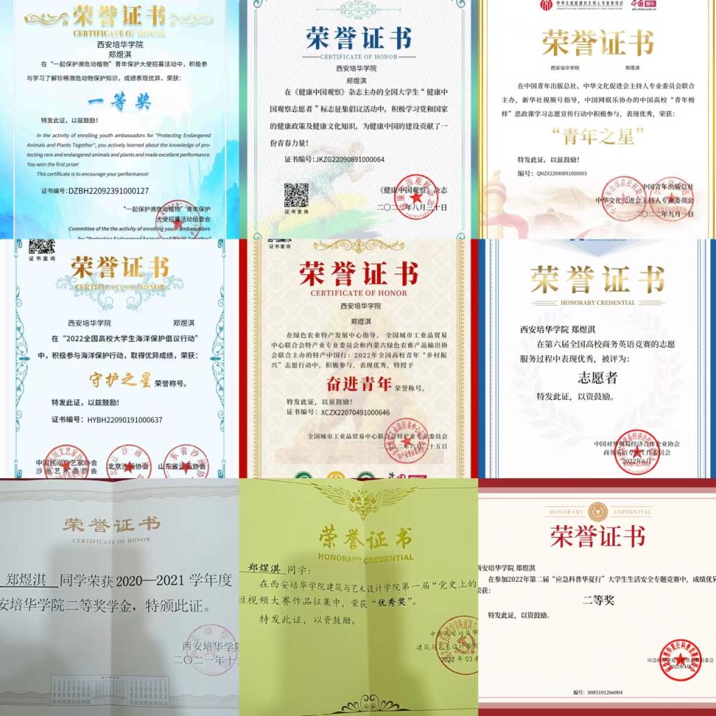 郑煜淇,正式党员,就读于西安培华学院建筑与艺术学院2020级视觉传达设计01班。在大学期间,她担任班级心理委员一职,也曾担任青年志愿者协会干事、西安培华学院英语口语协会社长一职,曾荣获2021年优秀学生干部、2022年三好学生,培华二等奖学金,全国大学生英语竞赛一等奖,普译奖全国大学生翻译比赛三等奖,第五届全国高校商务英语竞赛三等奖 ,全国高校创新英语英语词汇赛 优秀奖,全国高校大学生“一带一路”倡议宣传活动一等奖,2021年第二届全国大学生职业发展大赛”荣获校级赛三等奖,2022高校大学生诗词竞答大赛决赛二等奖,第二十六届CaTICs英语词汇赛 个人优胜二等奖等