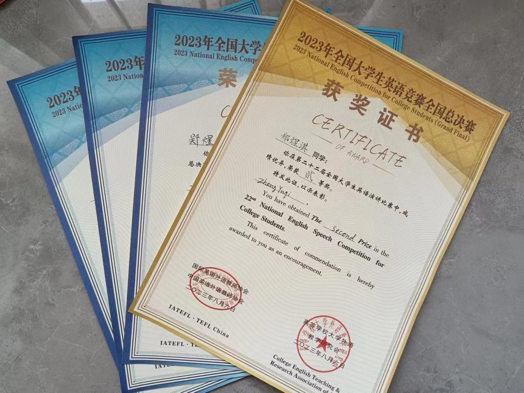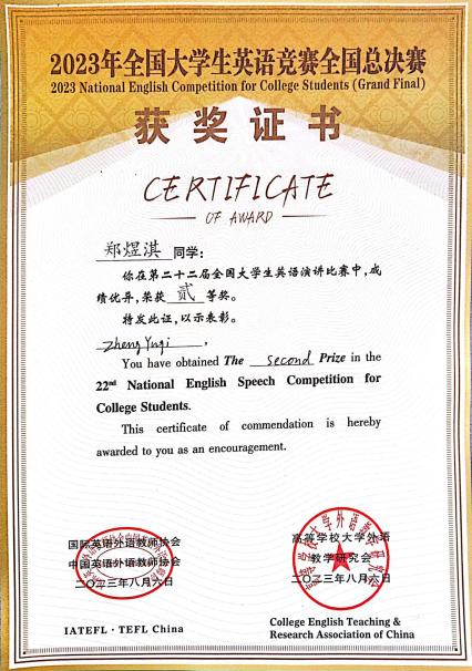在为期六天的总决赛中,我校选手郑煜淇与来自全国29个省份(自治区、直辖市)的259所高等院校的460名参赛选手同场交流、同台竞技。先后参加了全国优秀大学生英语学习经验交流会、第22届全国大学生英语演讲赛、第15届全国大学生英语风采大赛,并取得了演讲比赛全国二等奖的优异成绩,并选为2023年全国大学生英语竞赛全国总决赛优秀主持人、陕西代表队优秀志愿者。