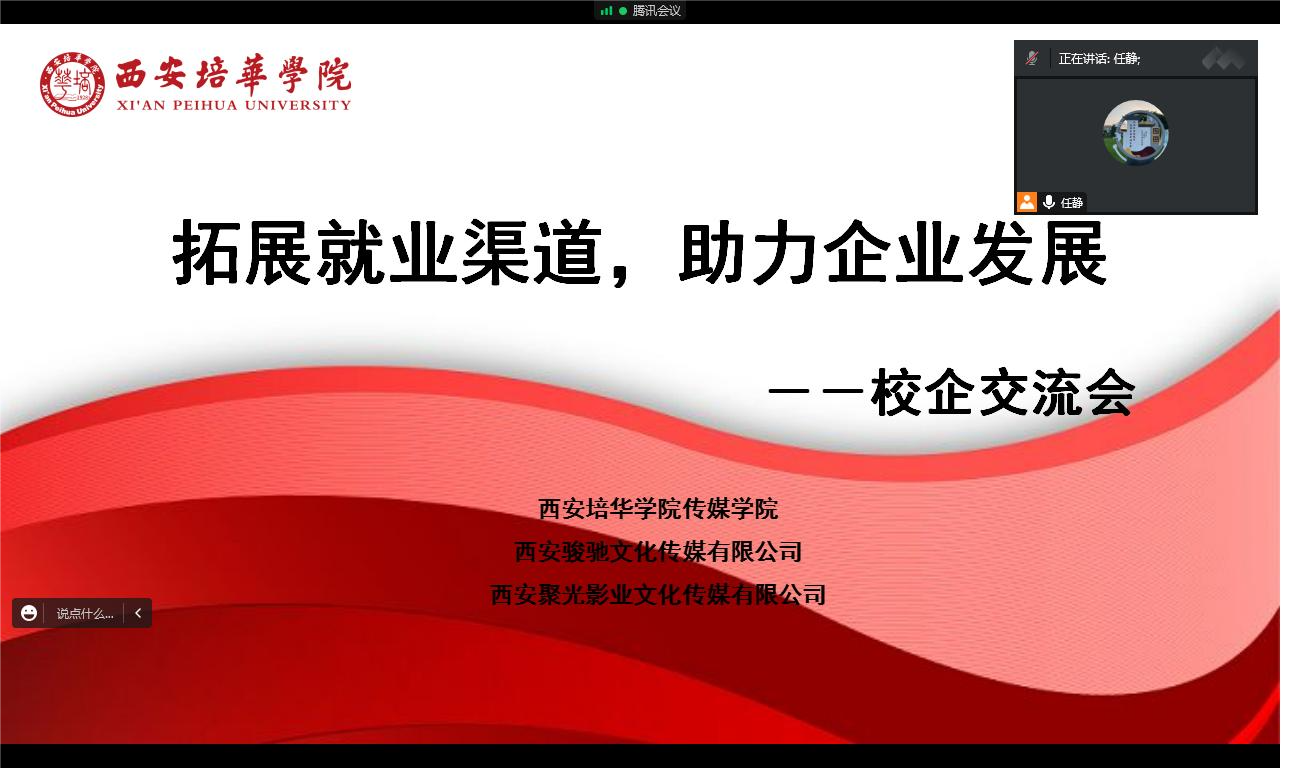 8月31日,受疫情影响,西安培华学院传媒学院党委书记兼行政副院长江俊瑞、辅导员乔安、田萌、杨丽、任亚婷等5人,通过腾讯会议的方式,分别与西安骏驰文化传媒有限公司、西安聚光影业文化传媒有限公司举行了线上座谈会。