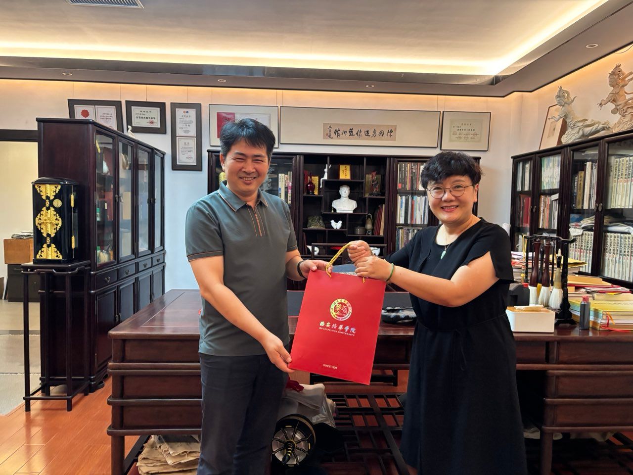 学院常务副院长徐莹代表学校向两家合作企业郑重赠送了西安培华学院定制茶杯。茶杯设计融合了学校校徽、办学理念等元素,既彰显了深厚的文化底蕴,也承载着校企携手共进的美好期许。校企双方均表示未来的进一步合作充满信心,一致表示将持续拓展合作广度与深度,实现资源共享、优势互补,共同为区域经济社会发展培养更多高素质应用型人才。